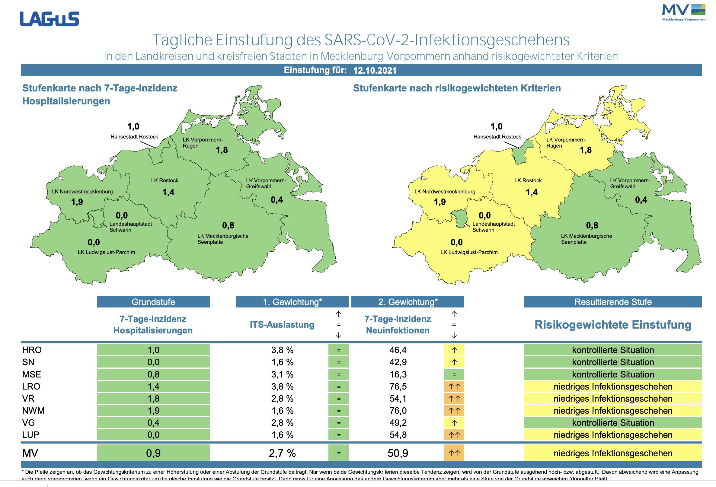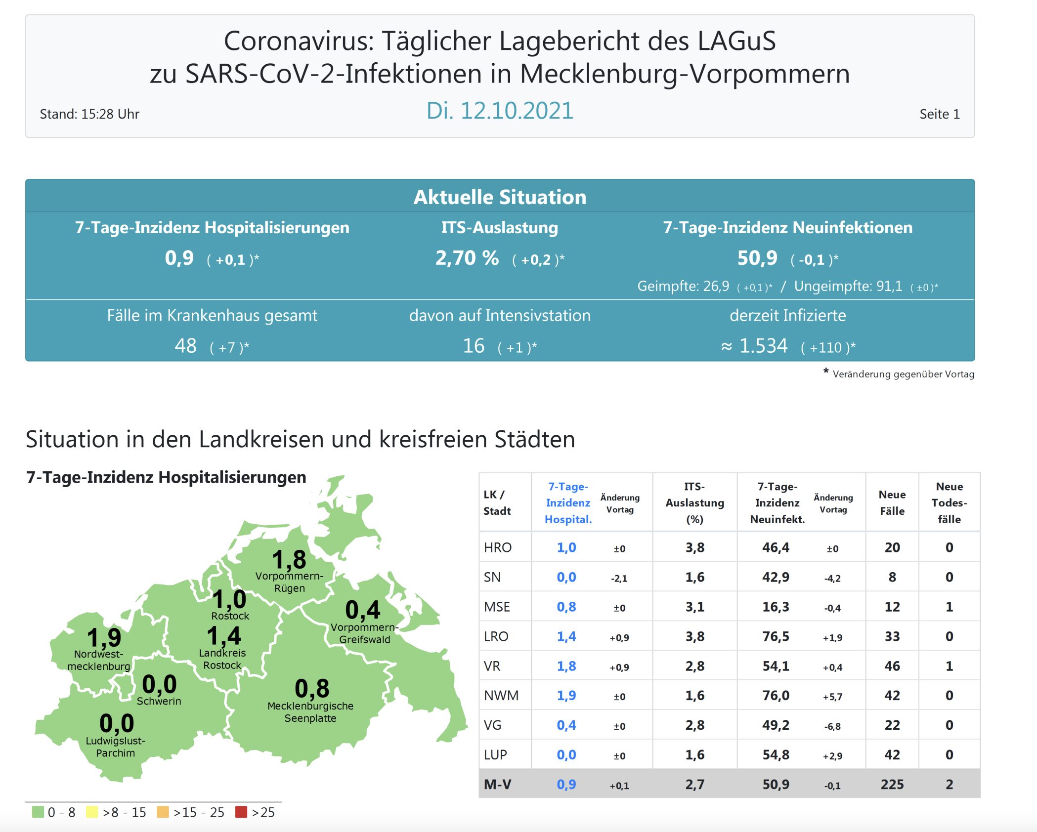 Die Hospitalisierung in ganz Mecklenburg-Vorpommern ist leicht gestiegen nd liegt jetzt bei 0,9 (gestern 0,8), die Inzidenz des Landes ist etwas gesunken und liegt bei 50,9 (gestern 51,0). Das Land Mecklenburg-Vorpommern meldet heute aber 225 Neuinfektionen und zwei neue Todesfälle.