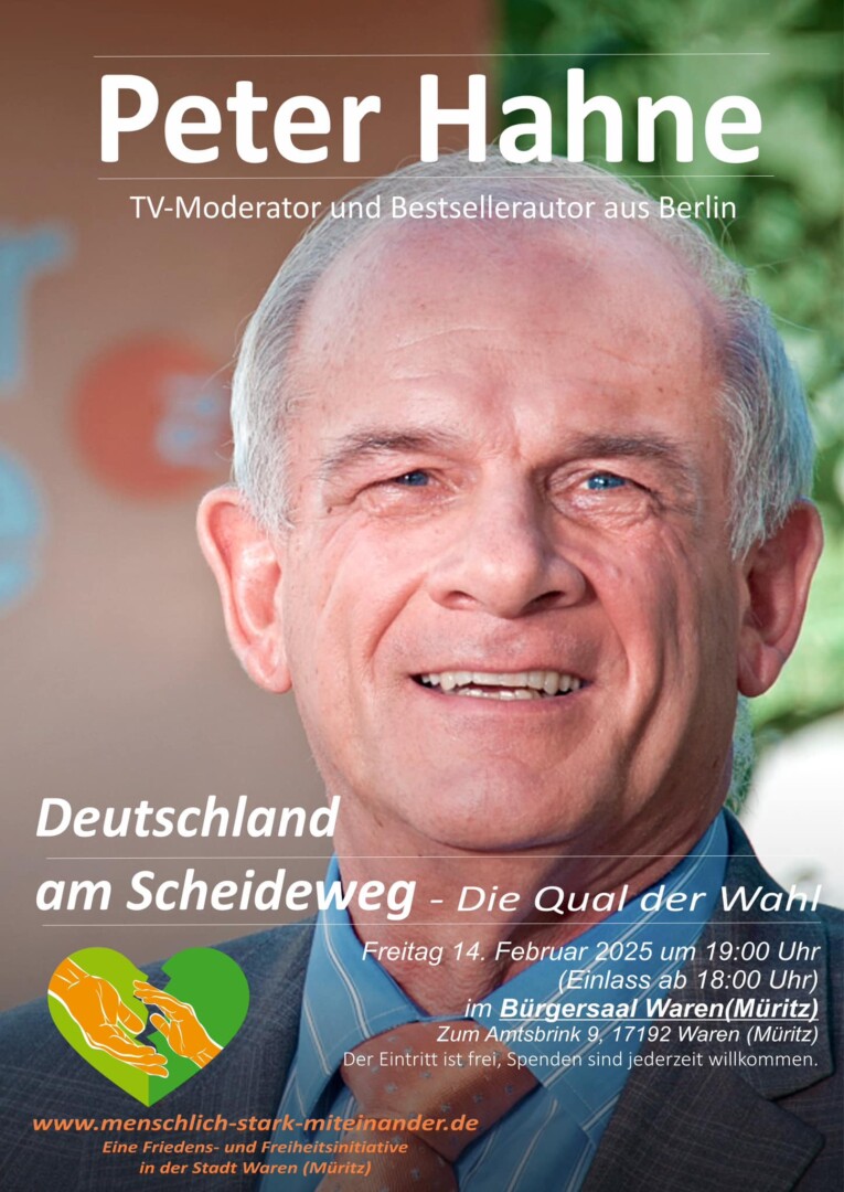 Auf Einladung der „Initiative Menschlich Stark Miteinander“, die sich seit Jahren jeden Montag auf dem Neuen Markt trifft, wird der Autor und ehemalige Fernsehmoderator Peter Hahne am 14. Februar in Waren zu Gast sein. Natürlich geht’s in seinem Vortrag, der unter dem Motto „Deutschland am Scheideweg – Die Qual der Wahl“ auch um die bevorstehende Bundestagswahl.