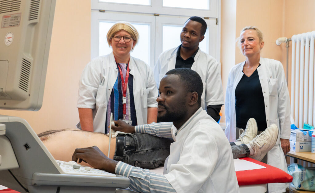 WeiterlesenLangsam fährt der Kinderchirurg Dr. Langa Michael Langa aus Tansania unter den aufmerksamen Blicken von zwei erfahrenen Kinderchirurginnen der Unimedizin Rostock mit der Ultraschallsonde über den Bauch eines Studenten und