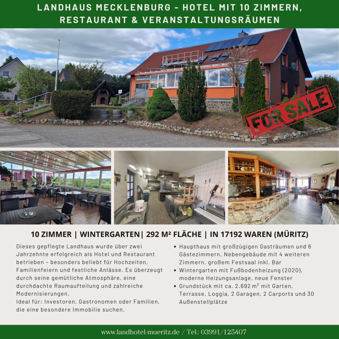 Seit über 20 Jahren wird das Landhaus in Warenshof vom Eigentümer-Ehepaar Schröder geführt. Mit großem Engagement und persönlicher Hingabe haben sie das Anwesen zu einer geschätzten Adresse für Urlauber, Genießer und Feiernde gemacht. Aus Altersgründen sucht dieses besondere Objekt nun einen neuen Besitzer.