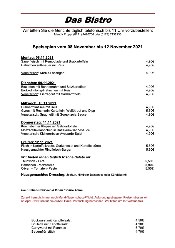 Neue Woche, neuer Speiseplan für „Das Bistro“ am Warener Amtsbrink. Los geht’s heute mit Sauerfleisch und Bratkartoffeln sowie Hähnchen süß-sauer.