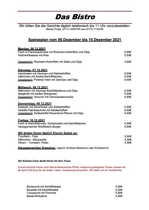 Fisch in Parmesankruste, Hühnerfrikassee mit Reis sowie Rosmarinkartoffeln mit Salat und Dipp stehen heute auf dem Speiseplan von „Das Bistro“ am Warener Amtsbrink.