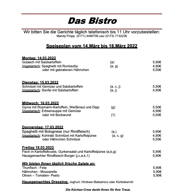 Die neue Woche startet in „Das Bistro“ am Warener Amtsbrink mit Gulasch sowie Spaghetti und Romisoße.