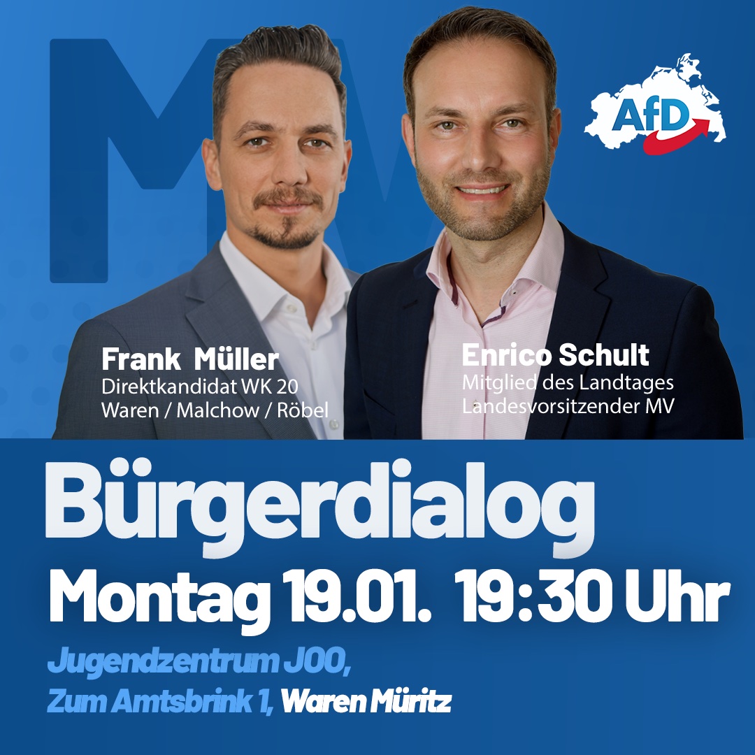 Am morgigen Montag, 19. Januar, laden der AfD-Direktkandidat für den Wahlkreis 20, Frank Müller, und der Spitzenkandidat der Landesliste sowie Landtagsabgeordnete Enrico Schult um 19.30 Uhr zu einem Bürgerdialog im Jugendzentrum JOO ein. Alle Bürger der Region Region sind herzlich willkommen.