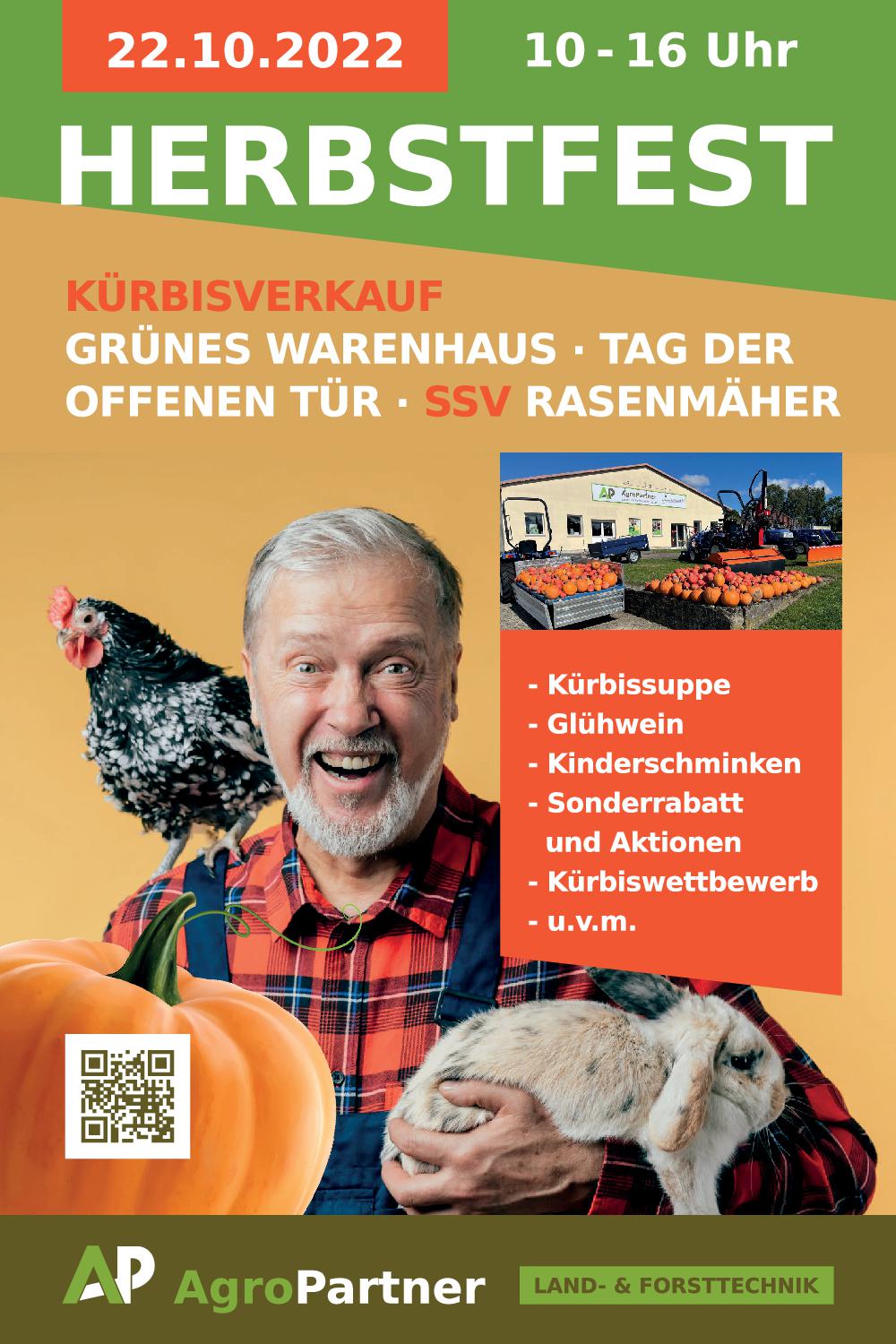 Herbstfest heißt es am kommenden Sonnabend, 22. Oktober, bei der Agropartner Land- und Forsttechnik GmbH im Tiergartenweg Neu Schloen. Für die Besucher wird einiges geboten: Kürbisschnitzen, Glühwein, Kinderschminken, Kürbiswettbewerb, Hüpfburg und Dinofahrten.