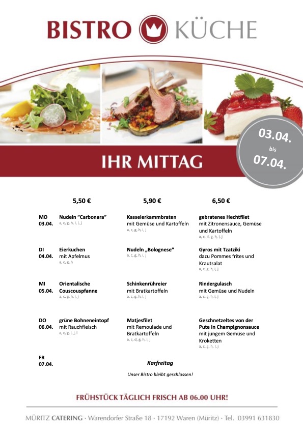 In der „Bistro-Küche“ von Müritz Catering mit Sitz im ÜAZ in der Warendorfer Straße beginnt die Woche mit „Carbonara“, Kasslerkammbraten und gebratenem Hechtfilet.