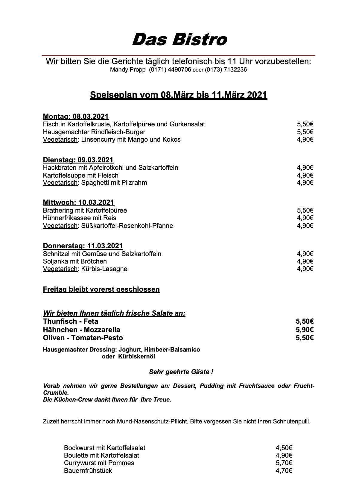 Die zweite Märzwoche beginnt in „Das Bistro“ am Warener Amtsbrink mit Fisch in Kartoffelkruste, hausgemachtem Rindfleisch-Burger sowie dem vegetarischen Gericht Linsencurry mit Mango und Kokos.