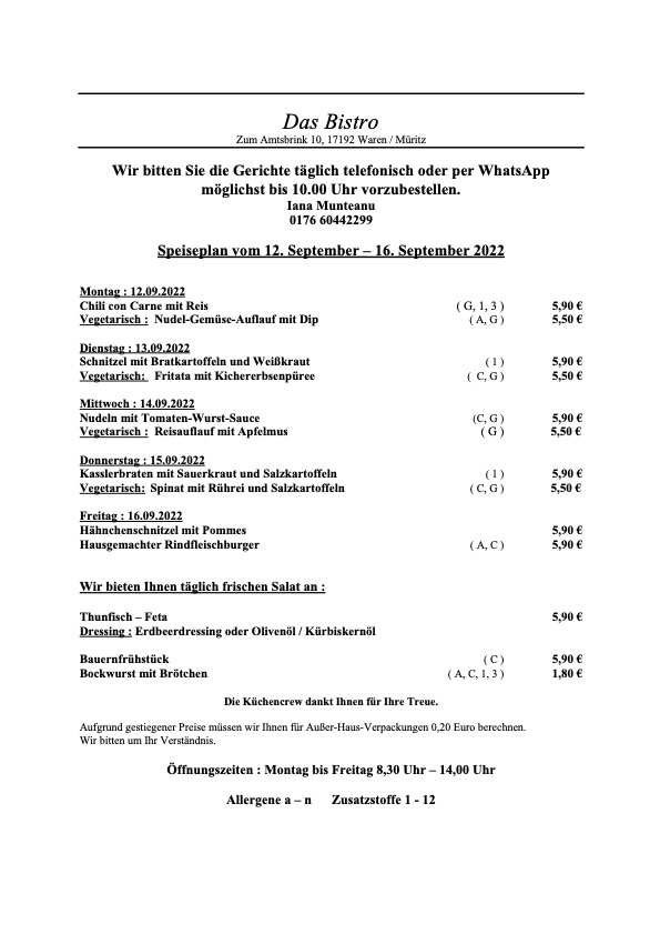 Mit Chili con Carne sowie Nudel-Gemüse-Auflauf startet „Das Bistro“ am Warener Amtsbrink in die neue Woche.