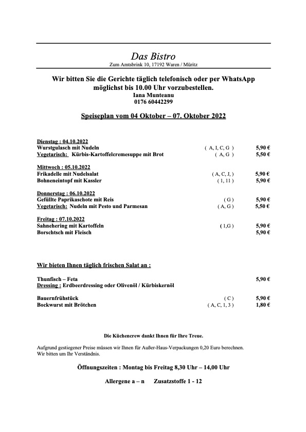 Die verkürzte Woche beginnt in „Das Bistro“ am Warener Amtsbrink mit Wurstgulasch und Nudeln sowie Kürbis-Kartoffelcremesuppe.