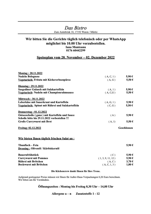 Mit Nudeln Bolognese sowie Frittata mit Kichererbsenpüree beginnt die neue Woche in „Das Bistro“ am Warener Amtsbrink.