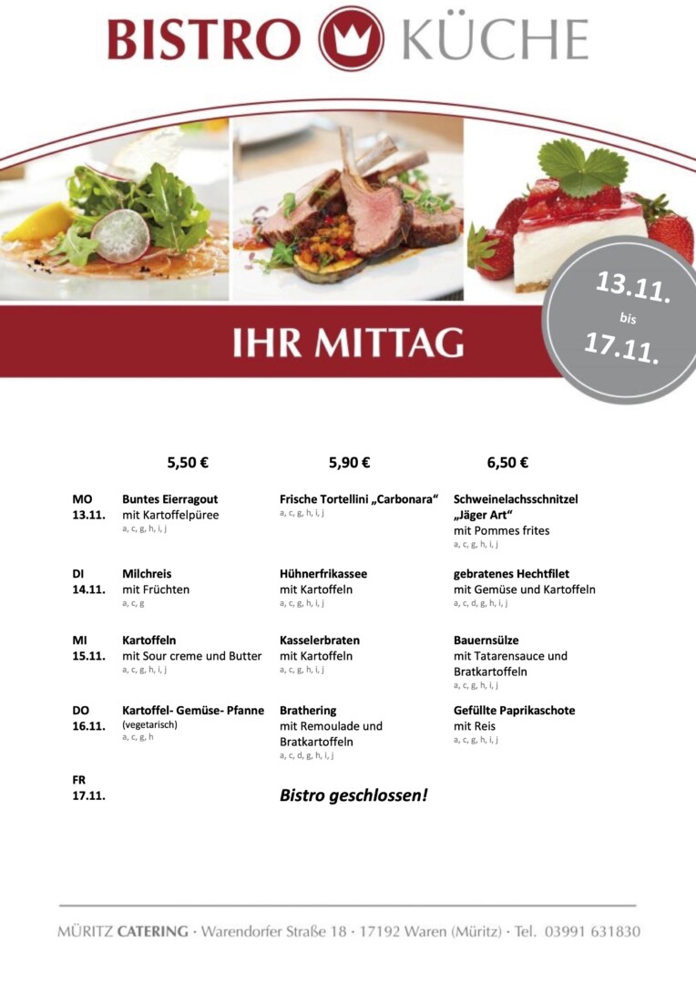 In dieser Woche ist die Bistro-Küche von Müritz Catering im Warener ÜAZ nur vier Tage geöffnet. Los geht’s heute mit Eierragout, frischen Tortellini sowie Schweineschnitzel „Jäger Art“.