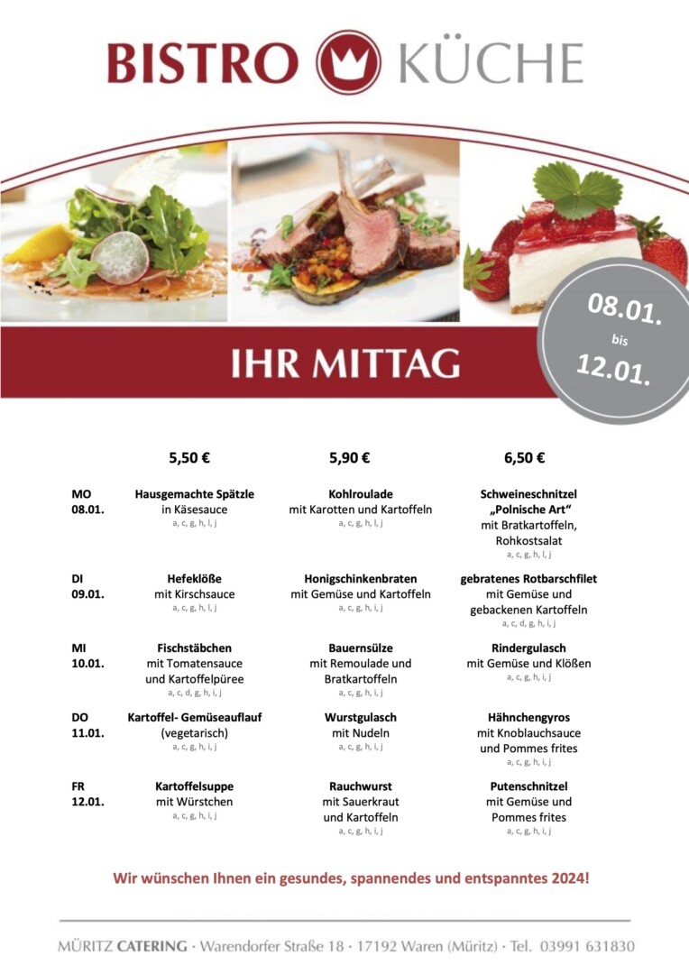 Mit hausgemachten Spätzle, Kohlroulade sowie Schweineschnitzel „Polnischer Art“ startet die Bistro-Küche von Müritz Catering im Warener ÜAZ in die neue Woche.