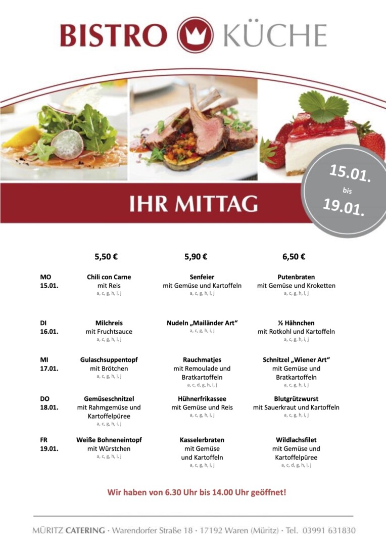 Mit Chili con Carne, Senfeiern sowie Putenbraten startet die Bistro-Küche von Müritz-Catering im Warener ÜAZ in die neue Woche.