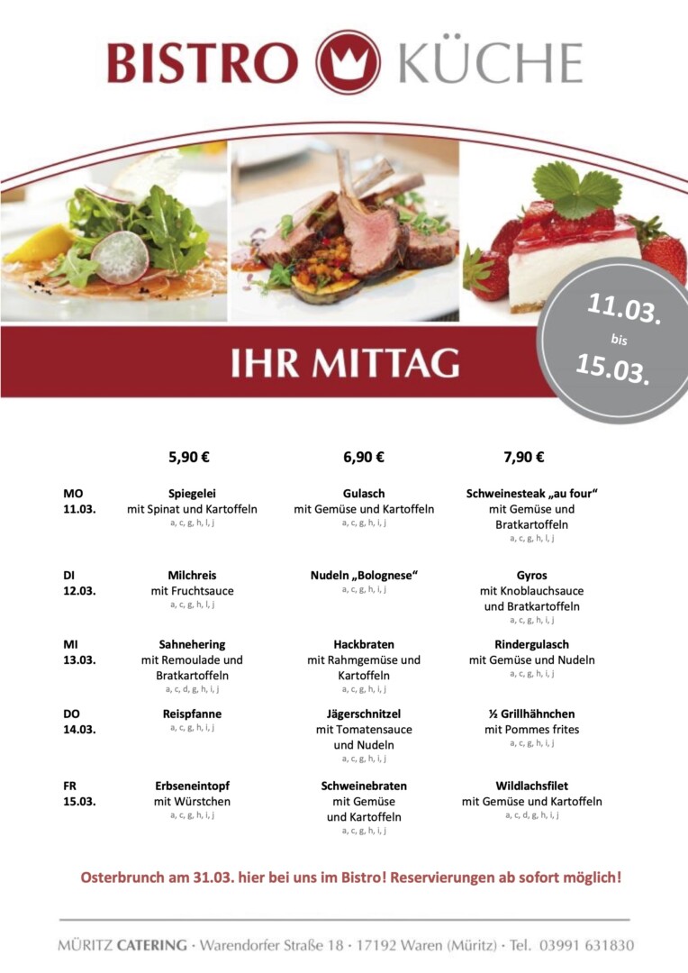 Der Urlaub ist vorbei, ab heute gibt’s in der „Bistro-Küche“ von Müritz Catering im Warener ÜAZ wieder leckeres Essen. Los geht’s heute unter anderem mit Gulasch und Schweinesteak „au four“.