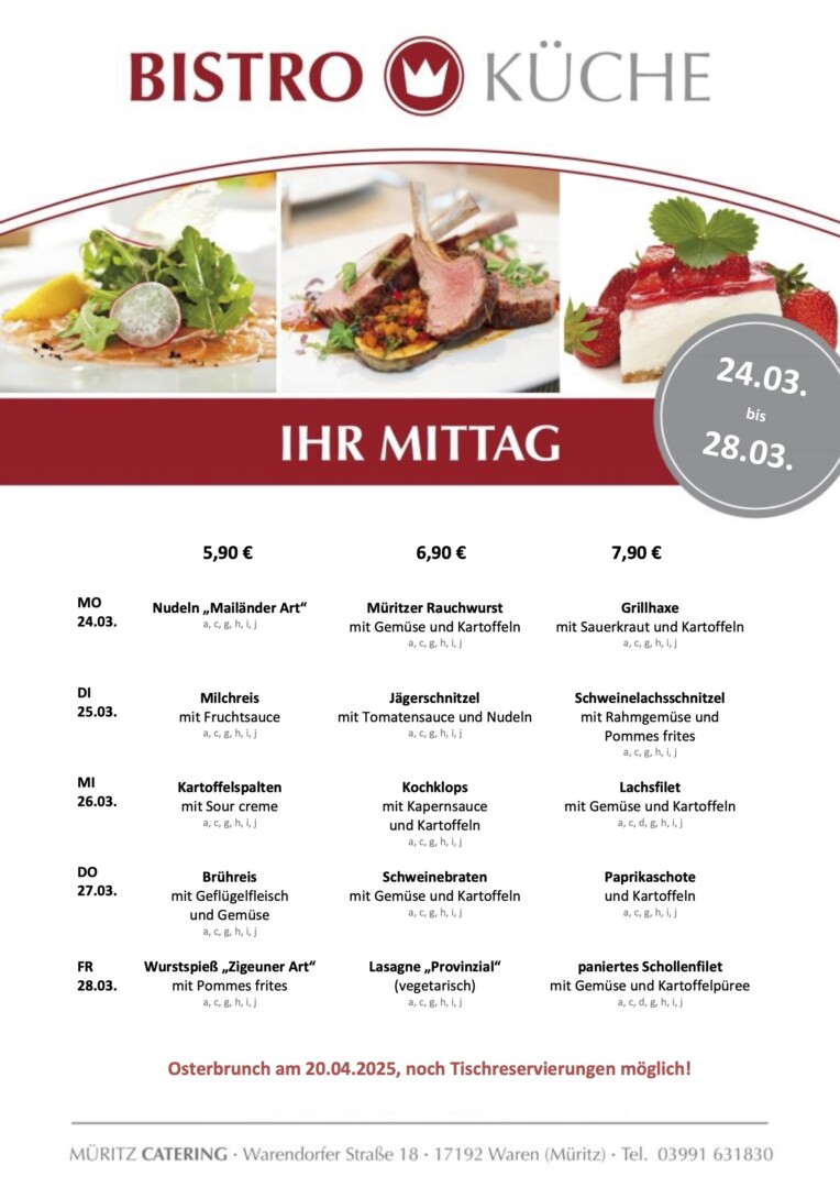 Nudeln Mailänder Art, Müritzer Rauchwurst sowie Grillhaxe werden heute in der Bistro-Küche von Müritz Catering im Warener ÜAZ serviert.