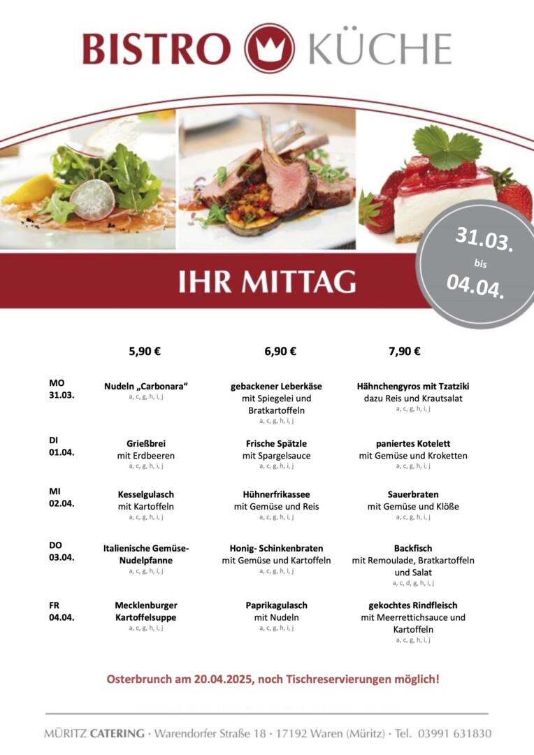 Neue Woche, neuer Speiseplan für die Bistro-Küche von Müritz Catering im Warener ÜAZ. Heute können sich die Gäste unter anderem Nudeln Carbonara, Gebackenen Leberkäse mit Spiegelei und Hähnchengyros mit Reis schmecken lassen.
