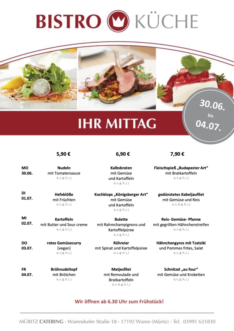 Letzter Tag des Monats Juni und Start in eine heiße Woche. Die beginnt in der Bistro-Küche von Müritz Catering im Warener ÜAZ mit Nudel und Tomatensauce, Kalbsbraten sowie Fleischspieß „Budapester Art“.