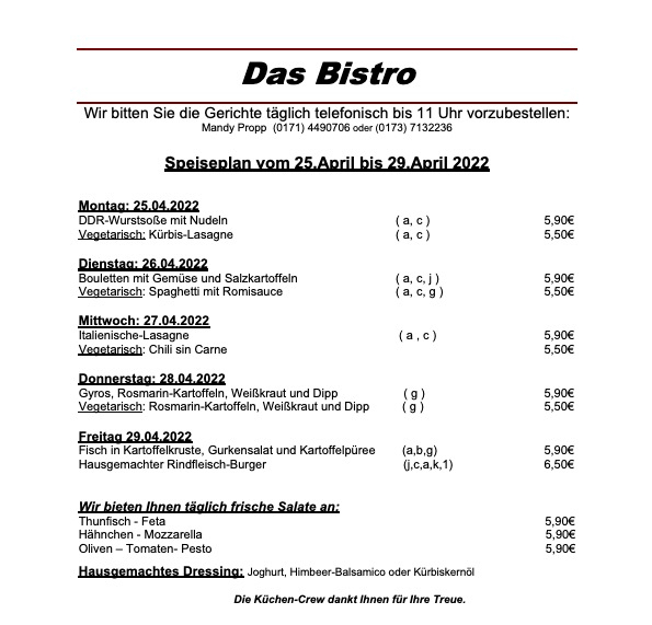 Hier wie immer am Montag der komplette Speiseplan: