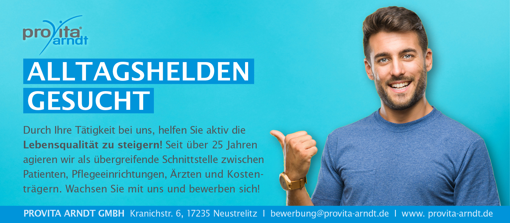provita arndt GmbH und unsere über 150 Mitarbeiter sind bereits seit 1996 die übergreifende Schnittstelle zwischen Patienten, Ärzten, Pflegeeinrichtungen und Kostenträgern. Dabei versorgen wir pflegebedürftige Menschen mit medizinischen Hilfsmitteln und Produkten. Durch unsere Tätigkeit im Innen- und Außendienst geben wir Hilfestellung als Schnittstelle, um eine optimale Teilhabe am Leben sicherzustellen. Unsere Motivation: Lebensqualität. Unser Ziel: hochwertige Patientenversorgung. Wachsen Sie mit uns und bewerben sich -> personal@provita-arndt.de