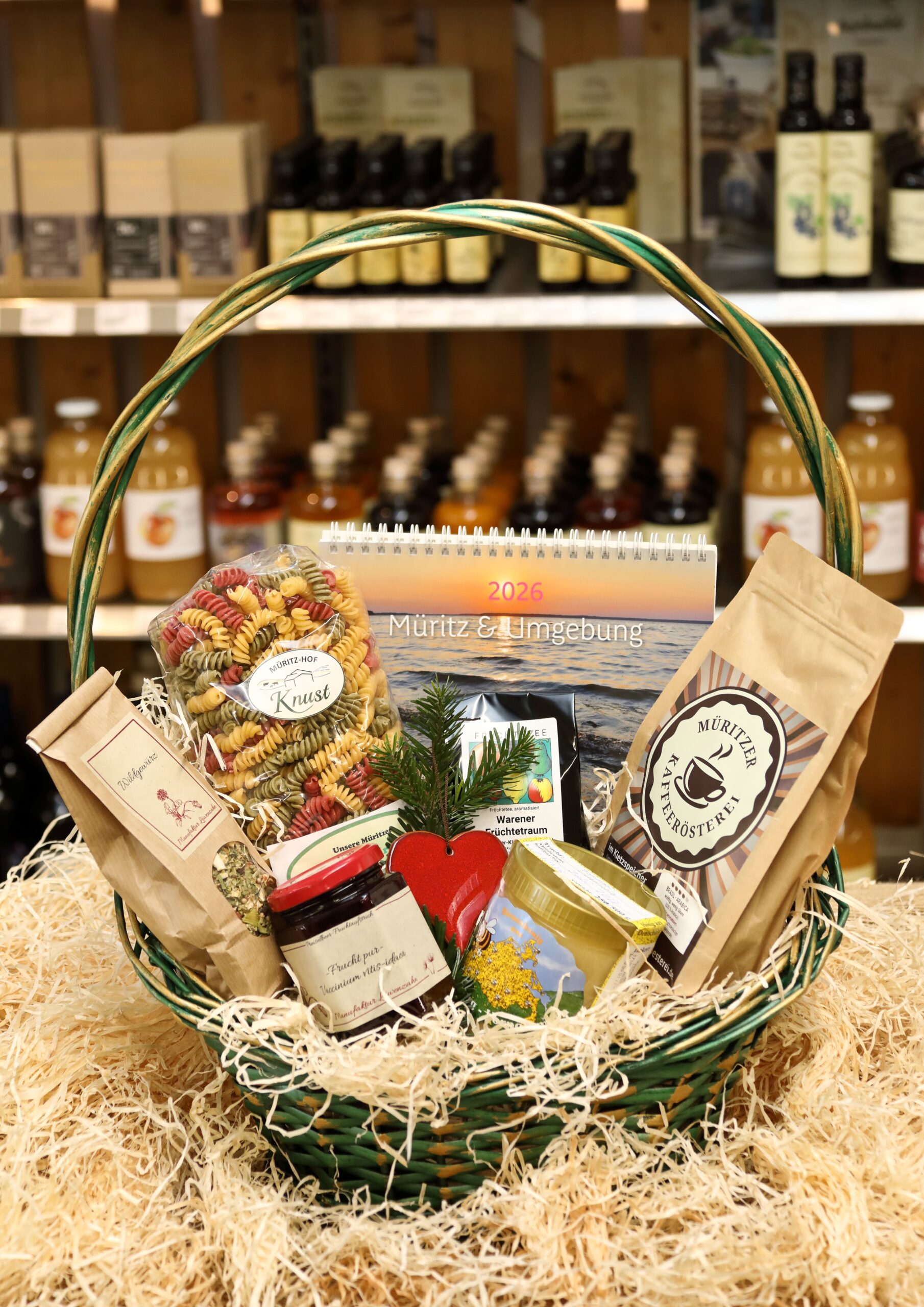 Das „Grüne Warenhaus“ der Agropartner Land- und Forsttechnik GmbH in Neu Schloen bietet auch in diesem Jahr wieder Präsentkörbe mit ausgewählten regionalen Spezialitäten aus der Region an. Darin unter anderem enthalten: hausgemachte Wurst- und Brotaufstriche, feinste Marmeladen, handgeschöpfte Schokolade, Mehl und Nudeln aus regionalem Anbau, edle Liköre und Weine, hochwertige Öle, duftende Seifen sowie leckere Tees und auch der Kalender der Warener Hobbyfotografin Nancy Beck.