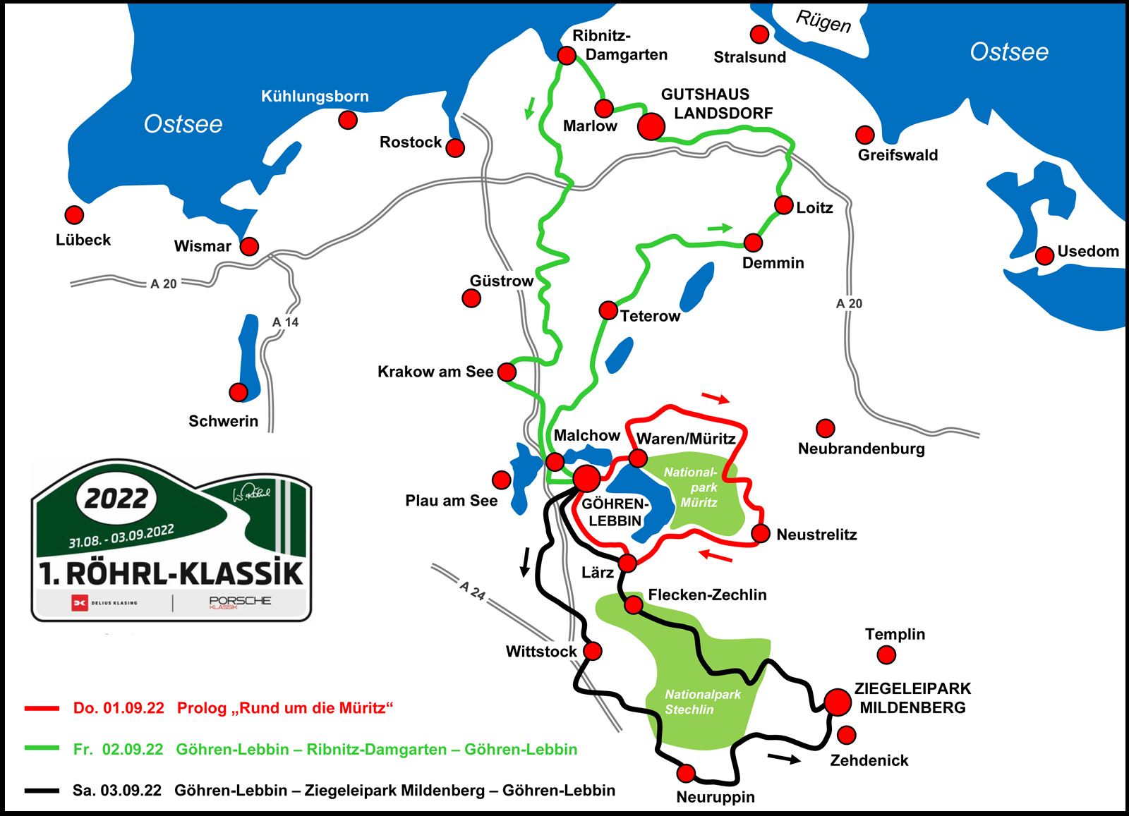 Mecklenburg-Vorpommern wird Schauplatz der 1. Röhrl-Klassik. Vom 1. bis 3. September werden die Mecklenburgische Seenplatte, Nationalparks, die Alleen, Plattenwege und wunderschönen Landstriche Mecklenburg-Vorpommers die Bühne für ein einzigartiges Schaulaufen von 111 historischen Porsche-Sportwagen. „Die Röhrl-Klassik ist die jüngste Gleichmäßigkeits-Ausfahrt und sie wird sicher auch eine der reizvollsten Sportwagen-Touren für Oldtimer- und Porsche-Fans werden“, sagt Peter Göbel, Ideengeber, Organisator und fünffacher deutscher Rallyemeister über die 1. Röhrl-Klassik. „Die Vorbereitungen laufen auf Hochtouren und die Routenplanungen sind vollständig abgeschlossen.“ Die Premiere der Röhrl-Klassik verläuft insgesamt über rund 800 Kilometer in sechs Etappen an zweieinhalb Fahrtagen.