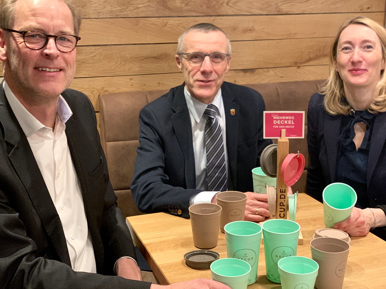 Foto oben: Backstuben-Geschäftsführerin Dr. Christina Kohn, Marketing-Chef Torsten Brand und Warens Bürgermeister Norbert Möller präsentieren die Pfandbecher.