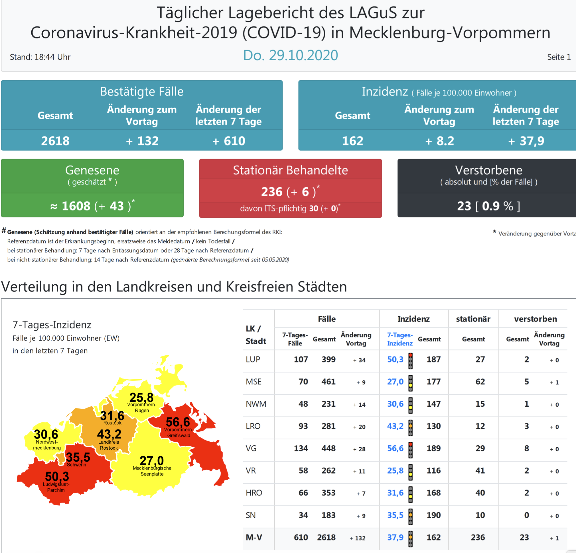 In Mecklenburg-Vorpommern sind bis zum Nachmittag 132 neue Corona-Infektionen registriert worden, davon 9 im Landkreis Mecklenburgische Seenplatte. Nach dem Landkreis Vorpommern-Greifswald überschreitet jetzt auch Ludwigslust-Parchim die 50-er Grenze. Auch die Zahl derjenigen, die in Kliniken behandelt werden müssen, steigt. Insgesamt wurden in MV bisher 2618 Infektionen festgestellt.