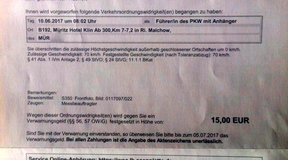 Wegen der Überschreitung der zulässigen Höchstgeschwindigkeit um 0 km/h soll er ebenfalls 15 Euro zahlen…