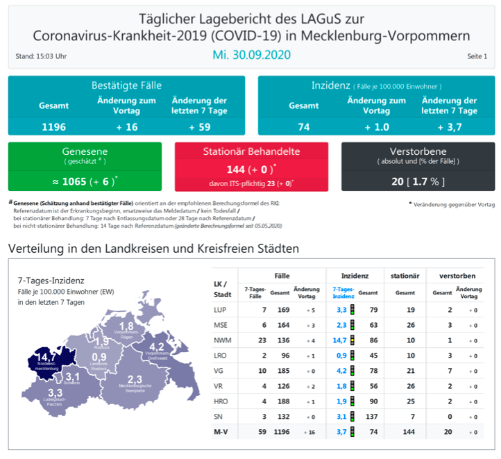 Landesweit müssen oder mussten den Angaben zufolge 144 Menschen in Kliniken behandelt werden, 23 (+0) von ihnen auf Intensivstationen.