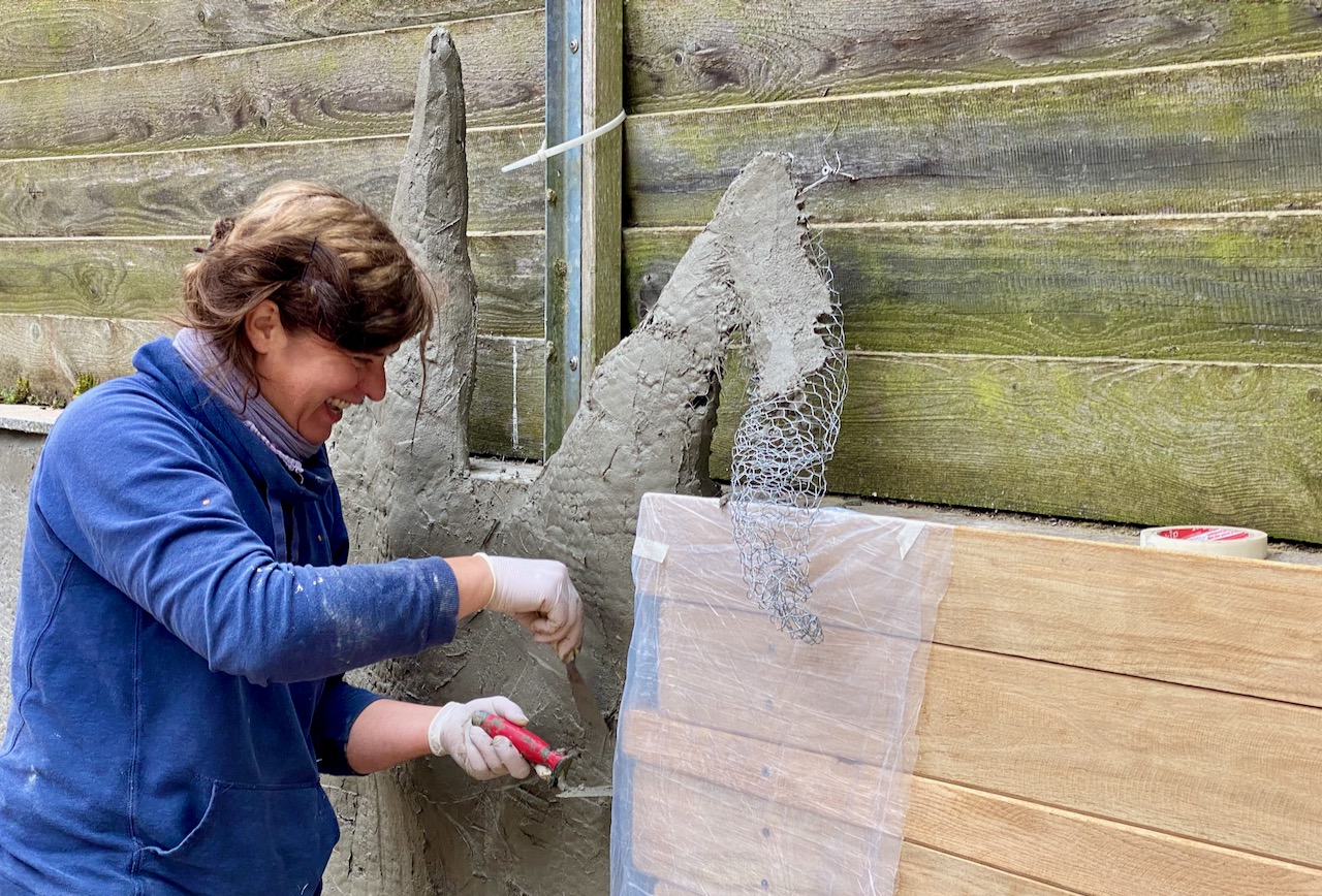 Das alte Spielgerät aus Holz hatte rund 15 Jahre auf dem Buckel und hielt den Vorgaben des TÜV nicht mehr stand. Außerdem waren Teile der einst sehr hübschen Mosaikwand zum Nachbargrundstück in einem schlechten Zustand. Auch sie wird gerade erneuert.