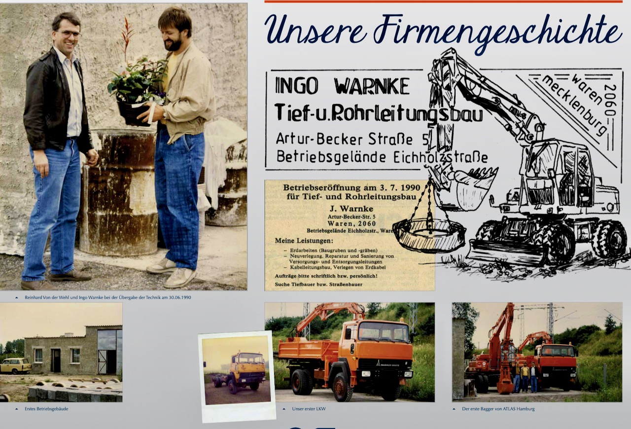 Los ging es vor 30 Jahren ohne Grundstück und ohne Geld, aber mit viel Mut und Enthusiasmus. Der Jungunternehmer mietete einen Teil der Fläche des heutigen Betriebsgeländes und reiste zunächst nach Hamburg, um sich dort nach passender Technik umzusehen und vor allem, um zu lernen. „Ich habe alles aufgesaugt“, erinnert sich Ingo Warnke. Mit einem Kredit der Sparkasse in Höhe von 200.000 DM wurden die ersten Maschinen angeschafft: ein Bagger, ein Lkw und ein Transporter. Am Anfang hangelte er sich von Auftrag zu Auftrag. Denn so unmittelbar nach Einführung der D-Mark wollten nur wenige Auftraggeber gleich kräftig investieren. Aber schon einige Monate später arbeiteten neun Leute für den Müritzer.