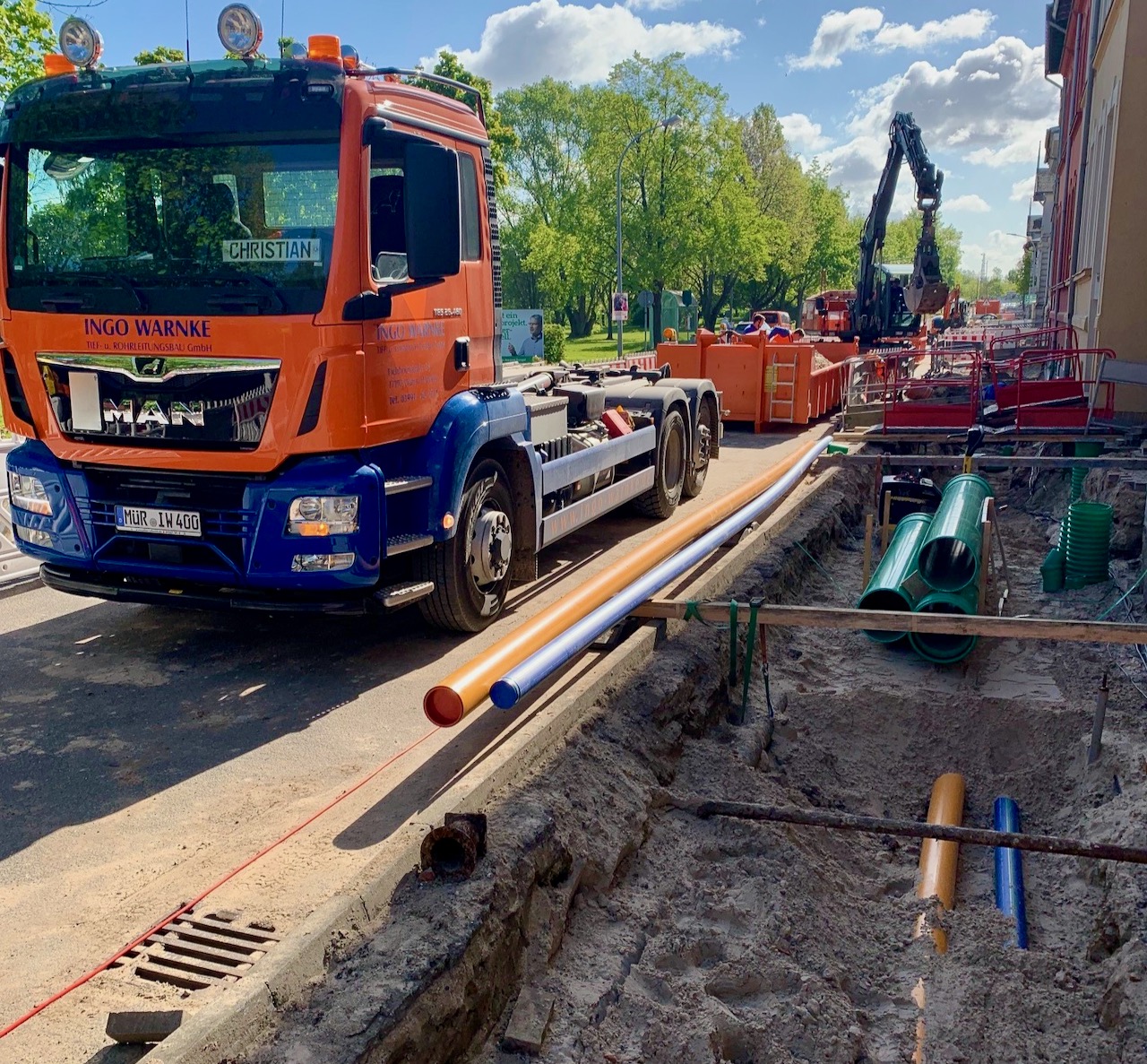 Neben dem Tief- und Rohrleitungsbau sind die “Warnke-Männer” – darunter mit Sohn Martin der zweite Geschäftsführer – auch im Straßenbau tätig, bauen Kleinkläranlagen und Pumpwerke, sind in ganz Deutschland unterwegs, um alte Böden aus Discountern zu fräsen und haben sich in den vergangenen Jahren zudem einen Namen bei der Schachtsanierung für die Industrie gemacht.