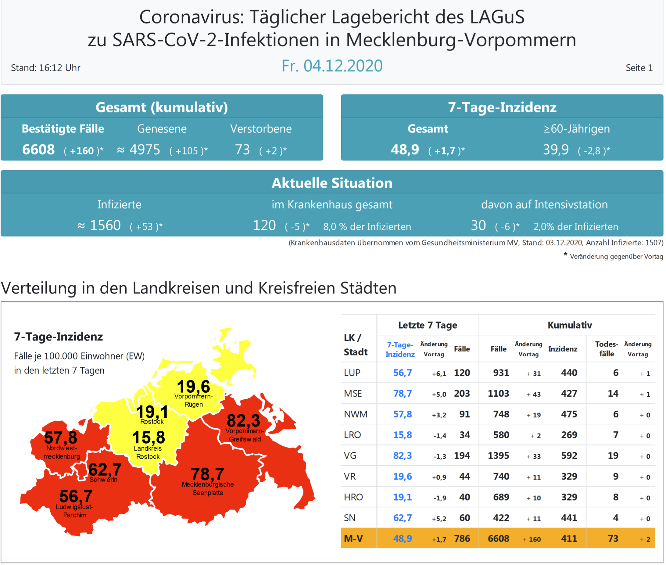 Insgesamt wurden in MV bisher 6608 Infektionen festgestellt. Laut einer Schätzung des Robert Koch-Instituts (RKI) sind in Mecklenburg-Vorpommern 4975 der positiv getesteten Menschen von einer Covid-19-Erkrankung genesen. Insgesamt gab es bislang 73 Todesfälle im Land, drei mehr als gestern.