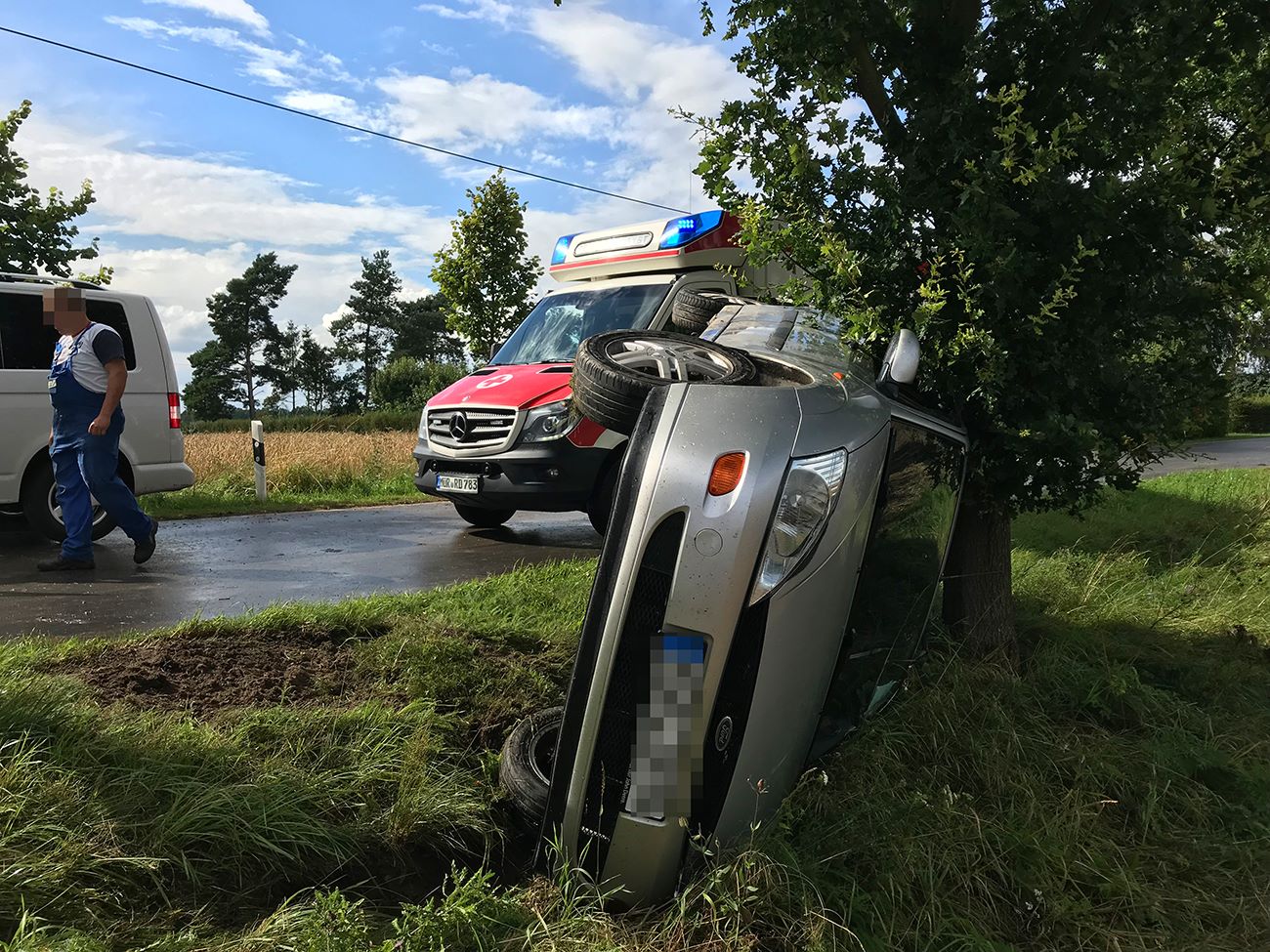 Bei einem Unfall auf einer Kreisstraße bei Friedrichshof in der Nähe von Röbel, ist am Nachmittag eine 18-jährige Autofahrerin leicht verletzt worden. Nach Polizeiangaben kam die Fahrerin offenbar aufgrund von nicht angepasster Geschwindigkeit, bei regennasser Fahrbahn in einer Rechtskurve erst links von der Fahrbahn ab und schleuderte anschließend mit der Dachseite gegen einen Straßenbaum.