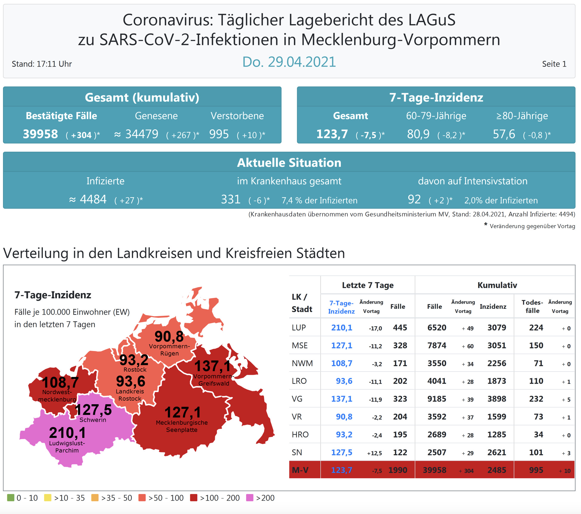 Der Inzidenzwert für ganz Mecklenburg-Vorpommern ist ebenfalls gesunken und liegt heute bei 123,7 (gestern 132,3). Insgesamt meldet das Land Mecklenburg-Vorpommern heute 304 Neuinfektionen.