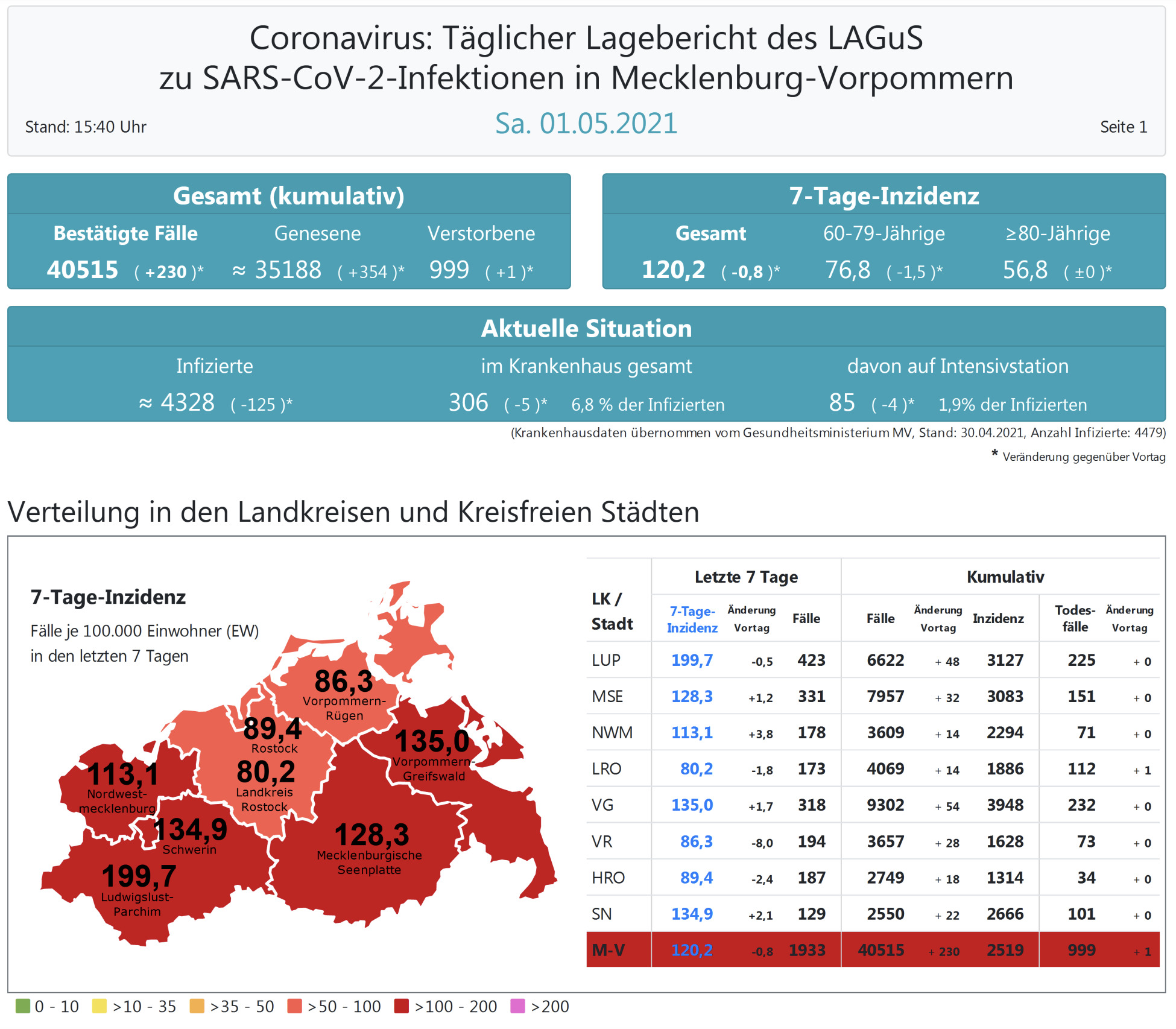 Der Inzidenzwert für ganz Mecklenburg-Vorpommern ist weiter gesunken und liegt heute bei 120,2 (gestern 121). Insgesamt meldet das Land Mecklenburg-Vorpommern heute 230 Neuinfektionen.