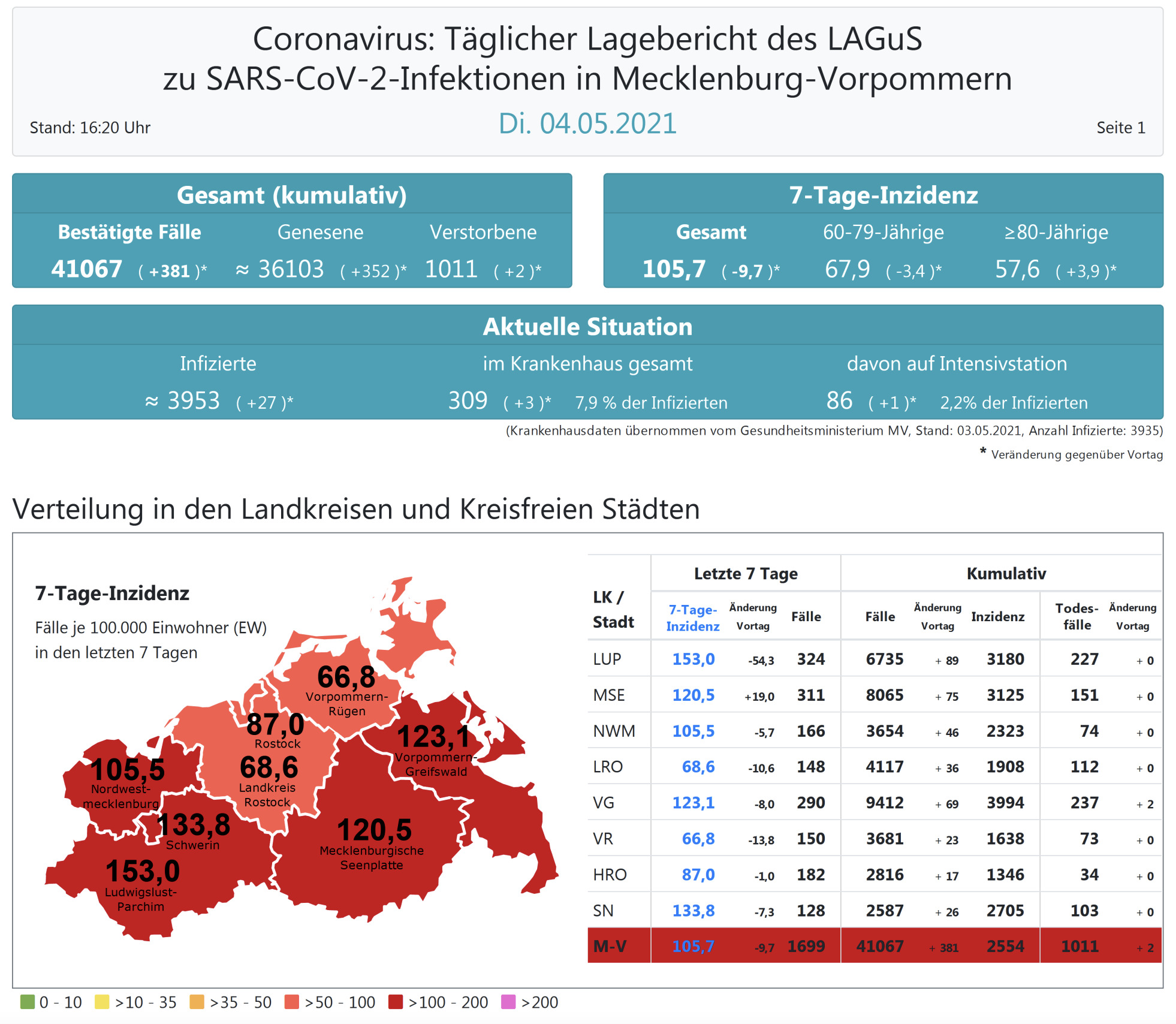 Der Inzidenzwert für ganz Mecklenburg-Vorpommern ist gesunken und liegt heute bei 105,7 (gestern 114,5 ). Insgesamt meldet das Land Mecklenburg-Vorpommern heute 381 Neuinfektionen.