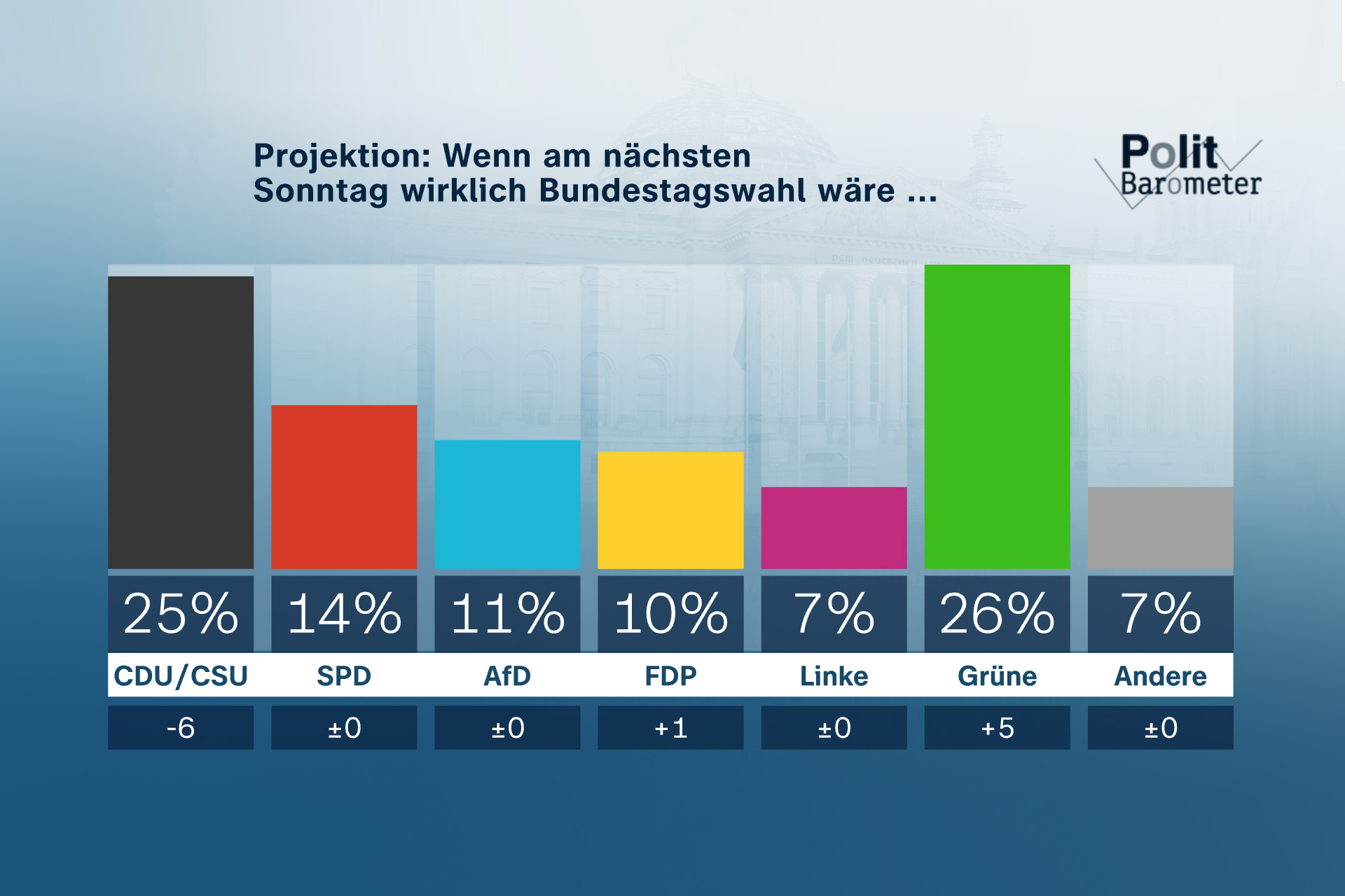 ZDF-Politbarometer: Vor gut zwei Wochen haben CDU/CSU und Grüne entschieden, wen sie ins Rennen um das Kanzleramt schicken. Für beide Parteien gibt es jetzt in der Politbarometer-Projektion starke Veränderungen: Wenn am nächsten Sonntag wirklich Bundestagswahl wäre, käme die Union nur noch auf 25 Prozent (minus 6 im Vergleich zu Mitte April), das ist ihr bisher schlechtester Wert. Die SPD könnte mit 14 Prozent rechnen und die AfD mit 11 Prozent, beide unverändert. Die FDP erhielte 10 Prozent (plus 1), und die Linke bliebe bei 7 Prozent. Die Grünen würden sich mit 26 Prozent (plus 5) deutlich verbessern und damit knapp vor der CDU/CSU liegen. Die anderen Parteien zusammen kämen weiterhin auf 7 Prozent. Damit hätte sowohl eine Koalition aus CDU/CSU und Grünen als auch eine Koalition aus Grünen, SPD und FDP eine Mehrheit. Knapp reichen würde es auch für Grün-Rot-Rot, nicht jedoch für eine Fortführung der Regierung aus CDU/CSU und SPD.