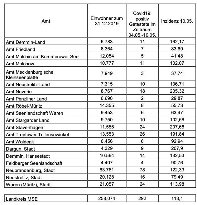 Dienstag – Zeit für die Inzidenz-Zahlen der einzelnen Städte und Ämter des Landkreises Mecklenburgische Seenplatte, die von der Kreisverwaltung einmal wöchentlich herausgegeben werden. Nach den neuesten Zahlen hat das Amt Stavenhagen mit 207,68 derzeit die höchste Inzidenz im Kreis. Das Amt Malchow meldet eine Inzidenz von 102,07, das Amt Penzliner Land von 29,87, das Amt Röbel-Müritz von 55,73, das Amt Seenlandschaft Waren von 63,47 und die Stadt Waren(Müritz) von 113,98.
