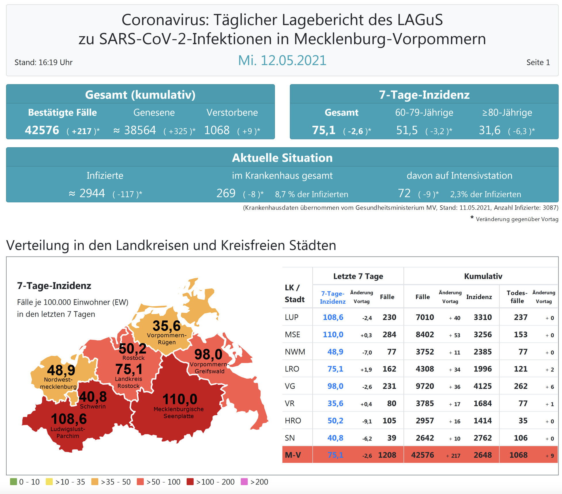 Der Inzidenzwert für ganz Mecklenburg-Vorpommern ist weiter gesunken und liegt heute bei 75,1 (gestern 77,7 ). Insgesamt meldet das Land Mecklenburg-Vorpommern heute 217 Neuinfektionen.