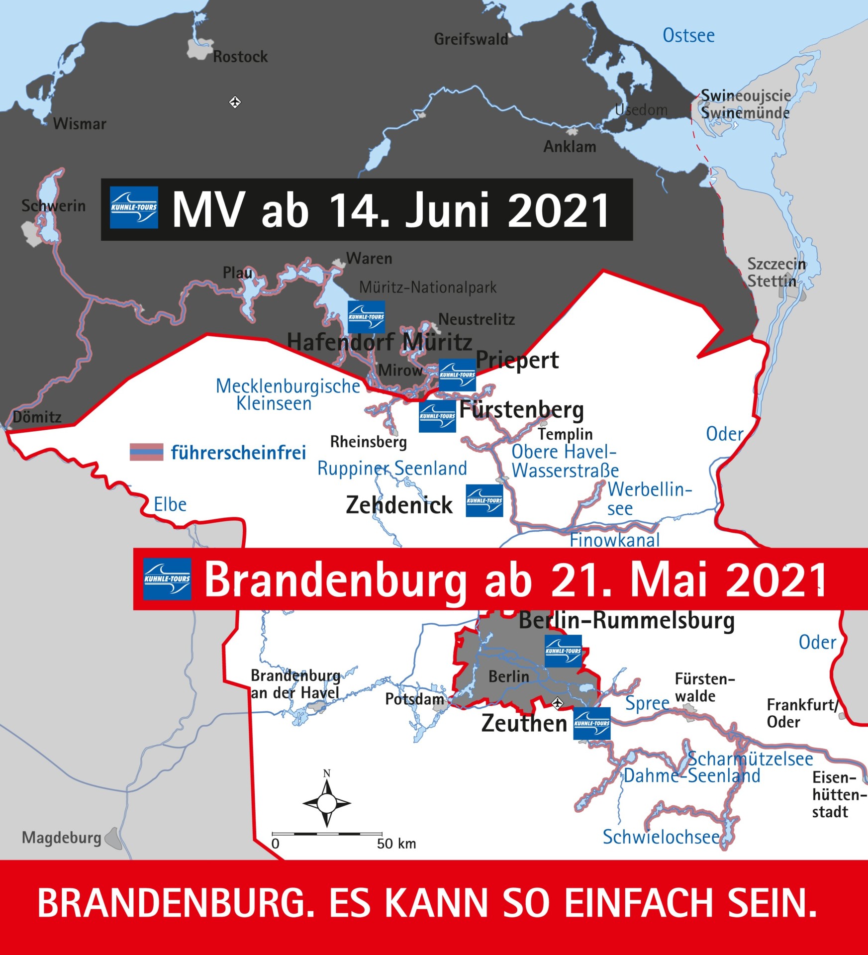 Das Charterunternehmen KUHNLE-TOURS zieht Konsequenzen aus der Corona-Politik des Landes Mecklenburg-Vorpommern und wird einen Teil seiner Flotte von der Müritz nach Brandenburg verlegen. Das teilte Geschäftsführer Harald Kuhnle, der die Firma vor 40 Jahren als Studenten Start-Up gegründet hat, am Hauptsitz der Unternehmensgruppe in Rechlin an der Müritz mit. „In den nächsten Tagen werden wir die ersten 20 Boote nach Zehdenick überführen“. Weitere Hausboote der größten deutschen Charterflotte werden nach Fürstenberg gebracht.