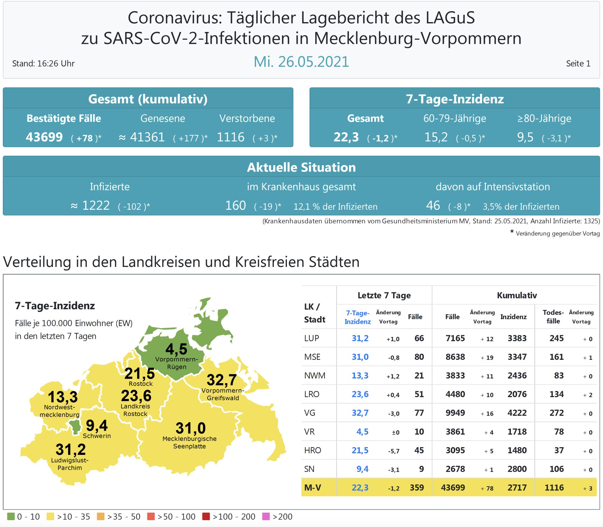 Der Inzidenzwert von ganz Mecklenburg-Vorpommern ist ebenfalls weiter gesunken. Er liegt heute bei 22,3 (gestern 23,5 ). Insgesamt meldet das Land Mecklenburg-Vorpommern heute 78 Neuinfektionen.