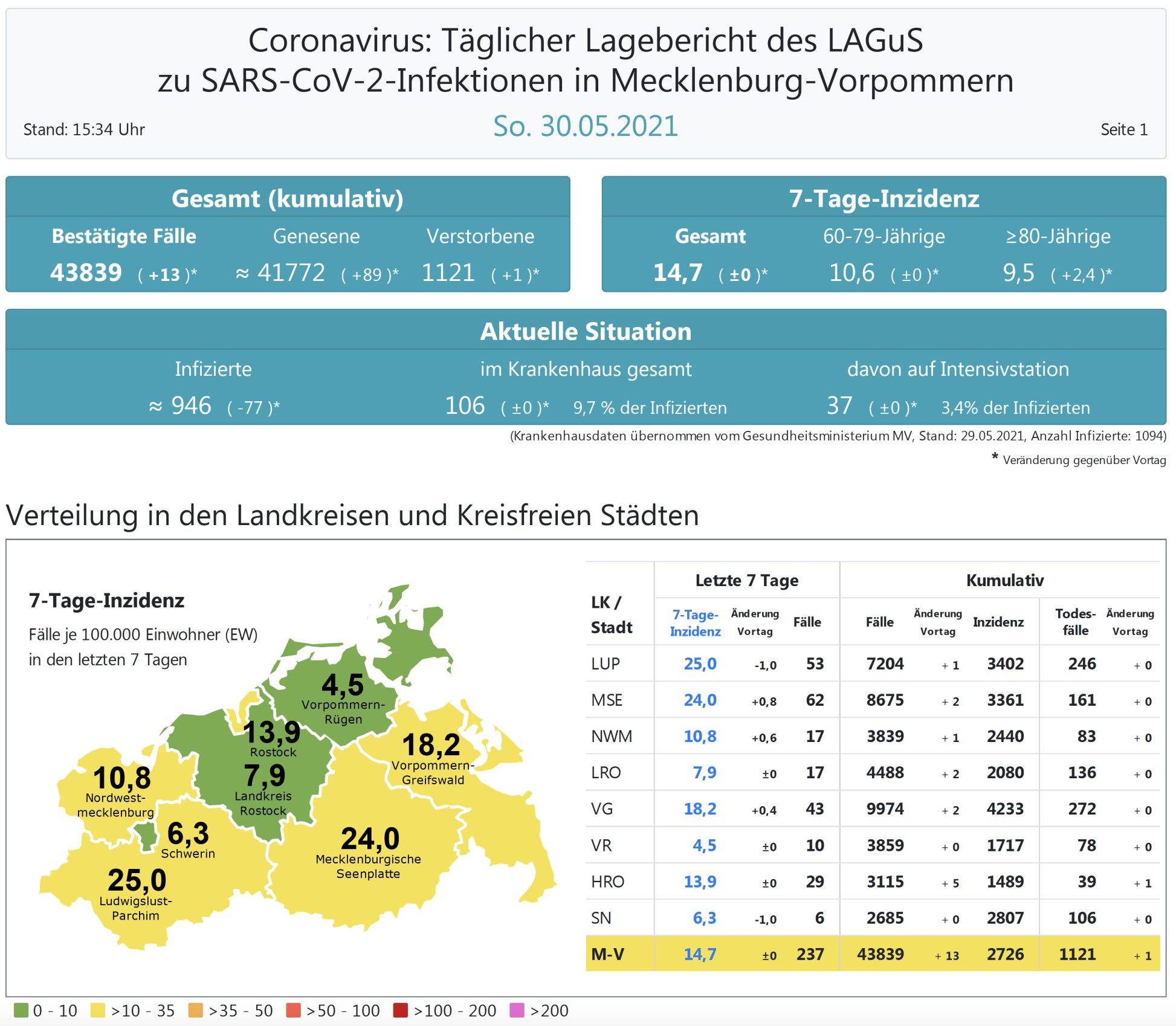 Der Inzidenzwert von ganz Mecklenburg-Vorpommern hat sich im Vergleich zu gestern nicht verändert. Er liegt heute bei 14,7 (gestern 14,7 ). Insgesamt meldet das Land Mecklenburg-Vorpommern heute 13 Neuinfektionen.