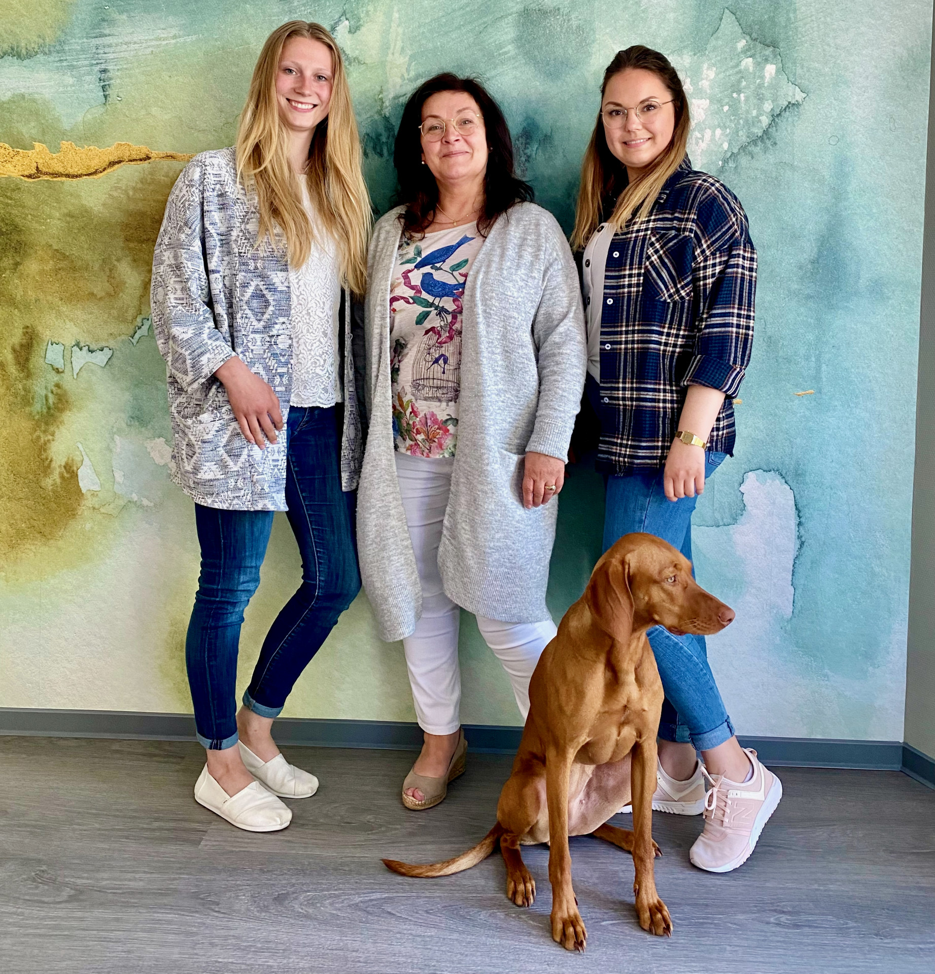 Foto: Das Therapeuten-Team: Henriette Weiss (Logopädin), Mitte: Kerstin A. Thiele (Inhaberin/Ergotherapeutin), Rechts: Sophie-Charlotte Granzow (Ergotherapeutin), Unten: Therapiehund Iara