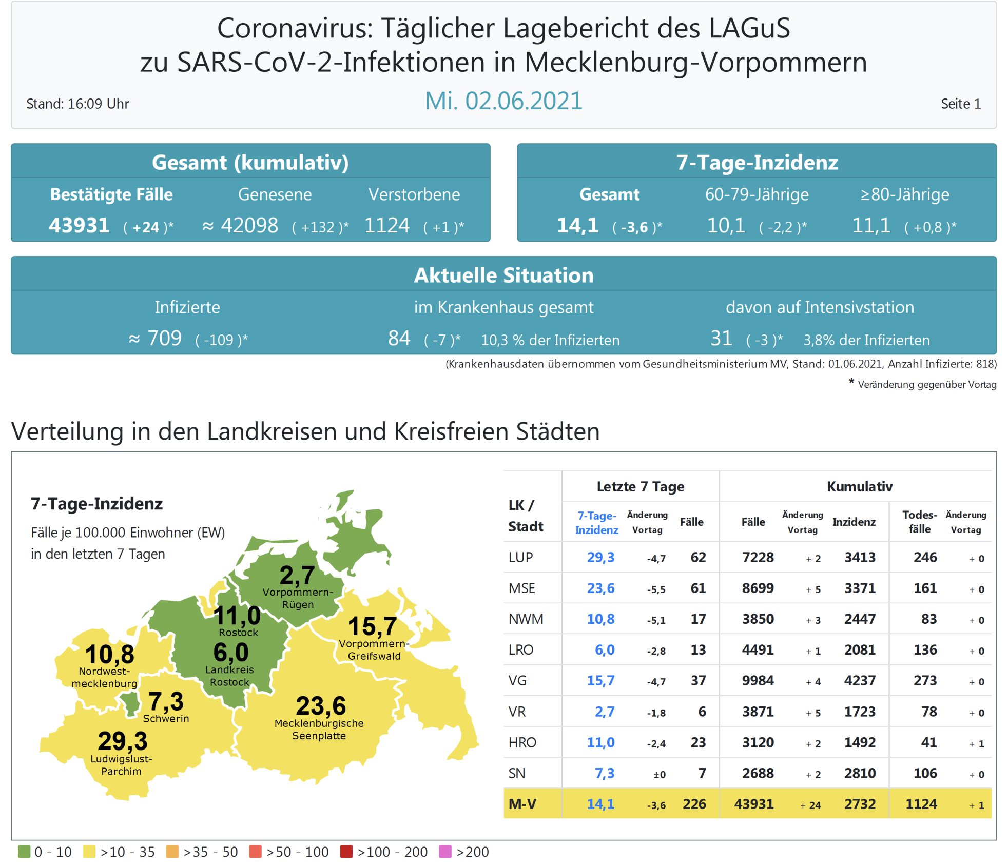 Der Inzidenzwert von ganz Mecklenburg-Vorpommern ist ebenfalls gesunken. Er liegt heute bei 14,1 (gestern 17,7 ). Insgesamt meldet das Land Mecklenburg-Vorpommern heute 24 Neuinfektionen.