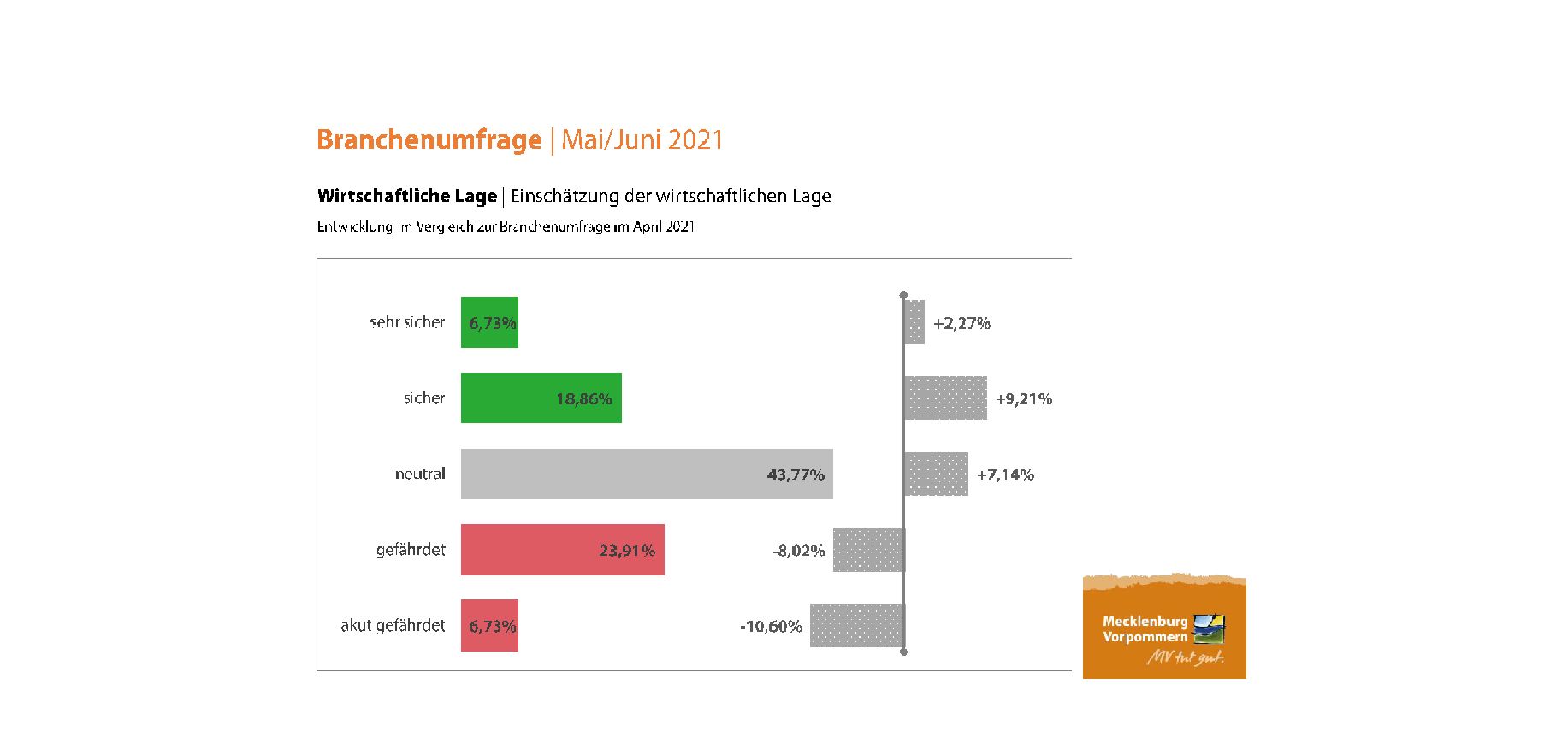 Die wirtschaftliche Lage der Unternehmen hat sich laut Umfrage etwas verbessert: Rund 31 Prozent der touristischen Unternehmen bezeichnen sich als gefährdet beziehungsweise akut gefährdet (vgl. Negativrekord April 2021: 43 Prozent). Rund jeder vierte Befragte schätzt seine Lage als sicher und sehr sicher ein. Auf die Frage, wie lange die Befragten ihr Unternehmen ohne weitere Hilfen noch durch die Krise führen könnten, gaben 23 Prozent an (vgl. April: 40 Prozent) noch bis Ende Juni durchzuhalten; 16 Prozent würden ihr Geschäft bis Ende des Jahres aufrechterhalten können, 33 Prozent darüber hinaus. Der Anteil der Unternehmen, die staatliche Hilfe benötigen, ist auf 53 Prozent leicht gesunken (vgl. April: 60 Prozent). Rund 42 Prozent der Arbeitnehmer befinden sich im Moment noch in Kurzarbeit.