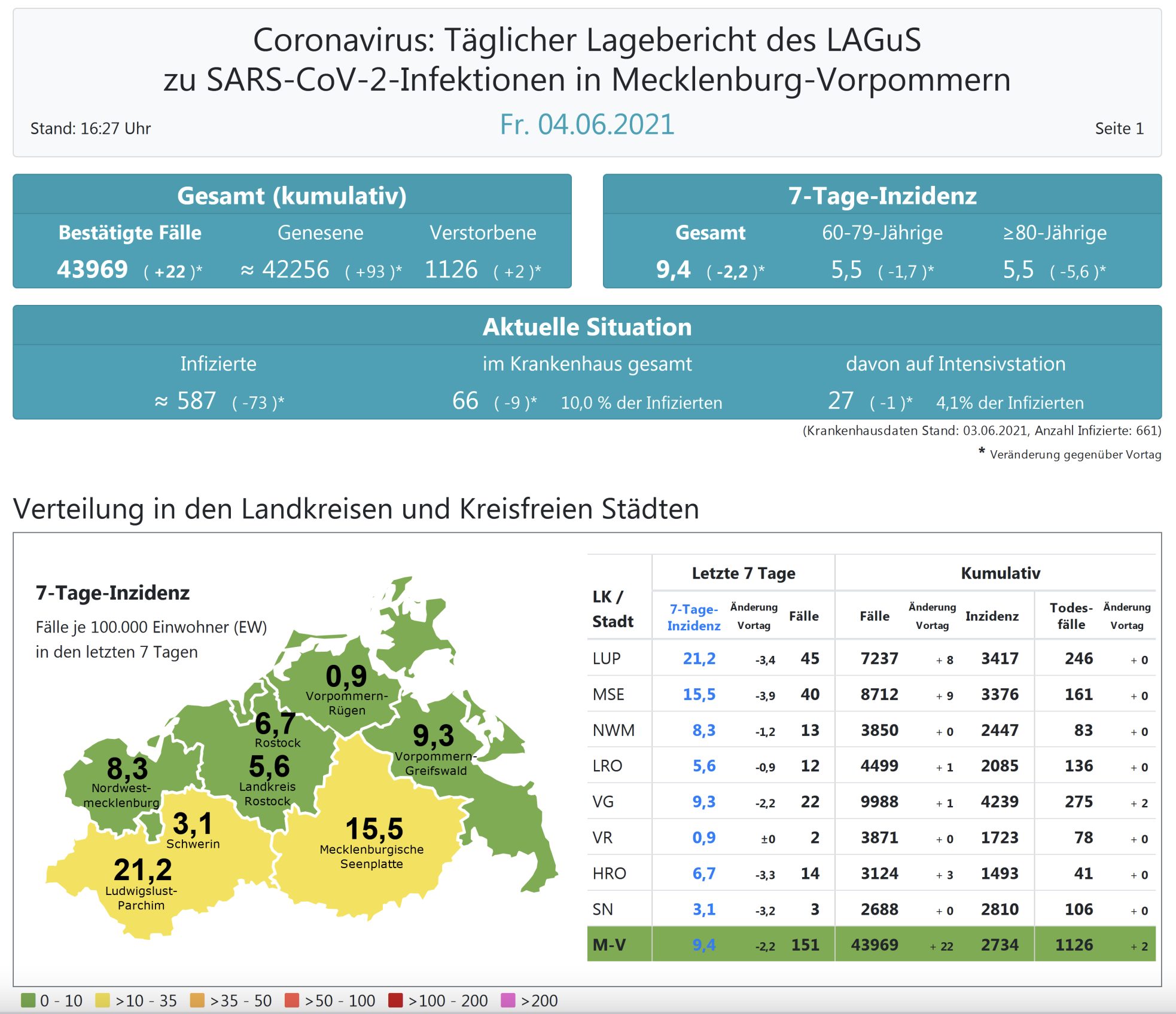 Der Inzidenzwert von ganz Mecklenburg-Vorpommern ist ebenfalls gesunken und liegt jetzt schon im einstelligen Bereich. Der MV-Wert wird heute mit 9,4 (gestern 11,7 ) angegeben. Insgesamt meldet das Land Mecklenburg-Vorpommern heute 22 Neuinfektionen.