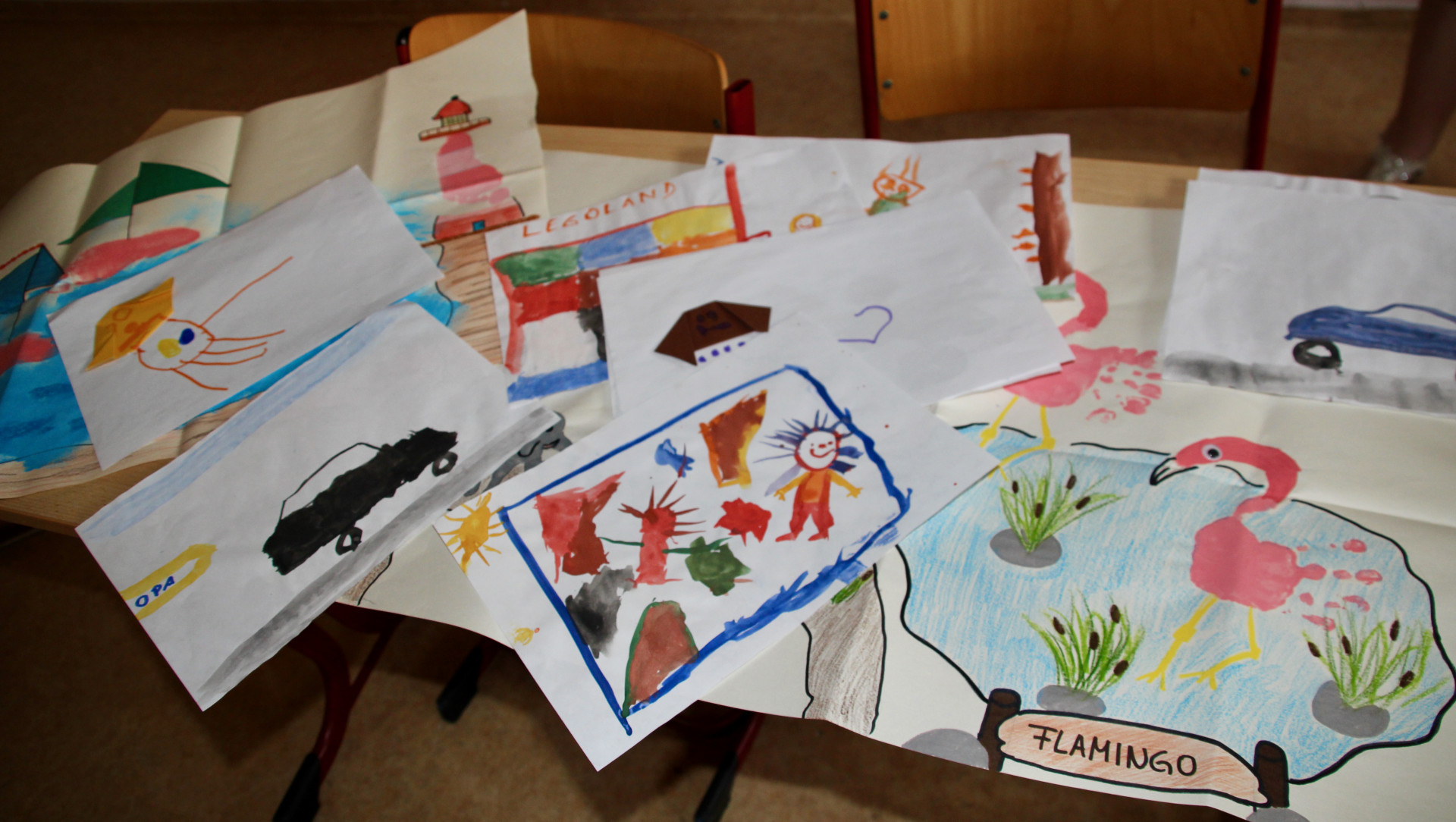 Die Kinder nutzten für ihre „Wunschbilder“ unterschiedliche Techniken. So gab es Collagen, Zeichnungen mit Pinsel und Wasserfarbe, Bilder gemalt mit Stiften und auch Drucktechniken. Einige der Bilder wurden mit anderen Materialien ergänzt. Auf die Kinderarbeiten schrieben die Erzieher die Wünsche der Kinder nach der Pandemie. Manchmal lag auch ein netter Brief dabei.