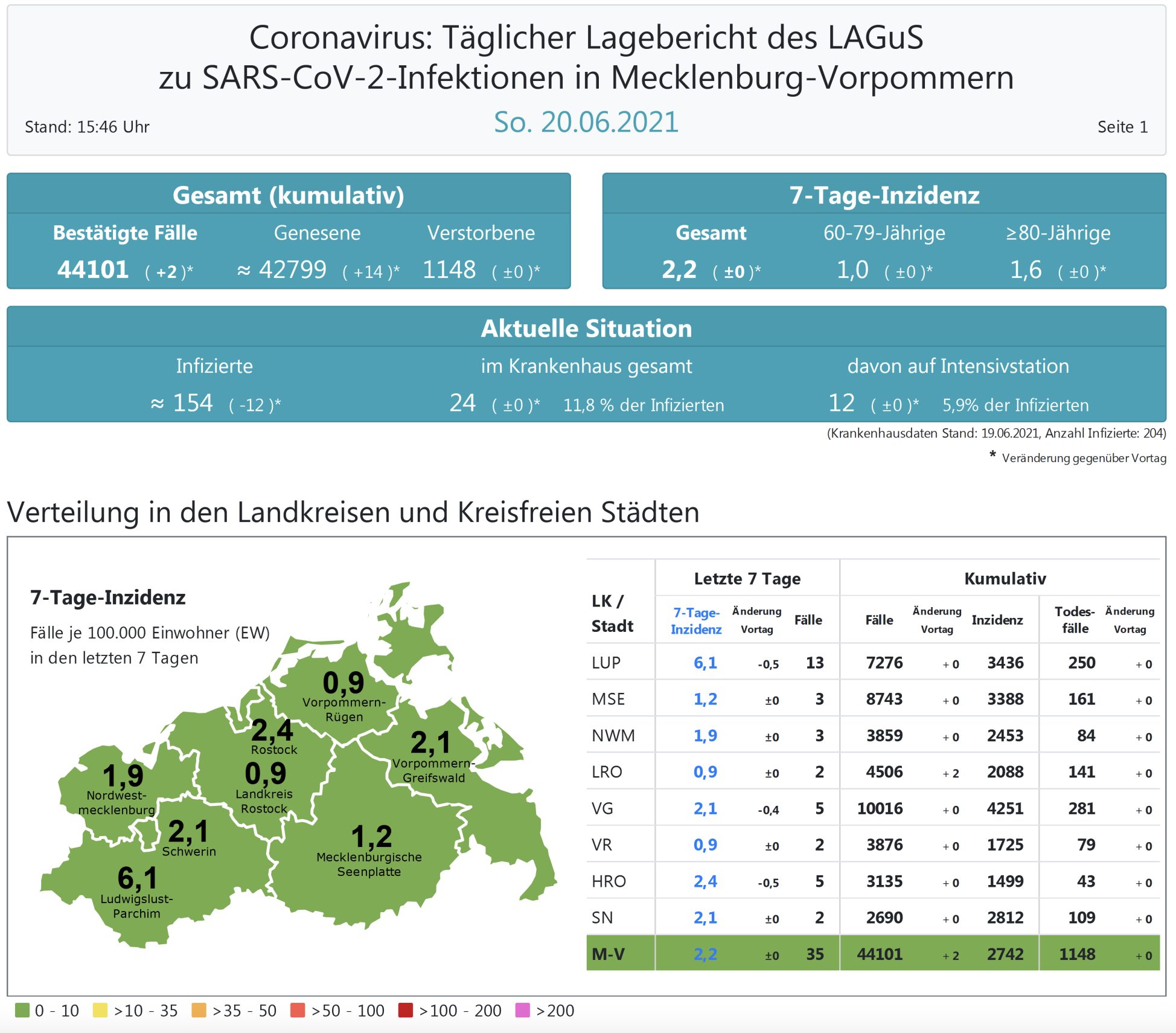Der Inzidenzwert von ganz Mecklenburg-Vorpommern hat sich ebenfalls nicht verändert. Er wird heute mit 2,2 (gestern 2,2 ) angegeben. Insgesamt meldet das Land Mecklenburg-Vorpommern heute 2 Neuinfektionen.
