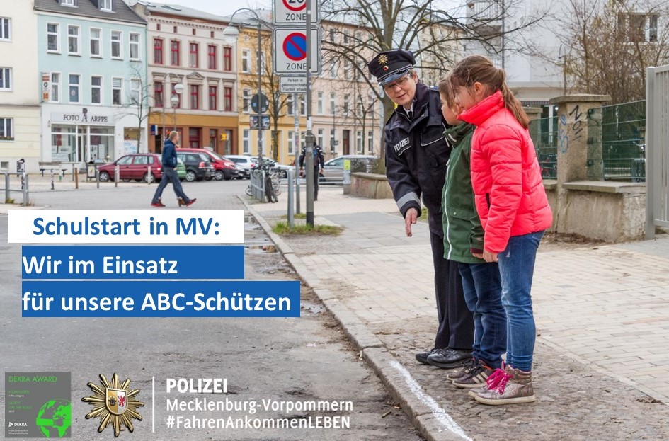 Morgen geht’s nach sechs Wochen Ferien wieder los in die Schule, auch 15 500 ABC-Schützen machen sich in Mecklenburg-Vorpommern auf den Weg. Die Polizei bittet deshalb alle Verkehrsteilnehmer um ganz besondere Vorsicht und legt im Monat August auch ein besonderes Augenmerk auf die Schulwegsicherung. Auch Innenminister Torsten Renz appelliert an alle Verkehrsteilnehmer: „Seien Sie bitte besonders aufmerksam im Straßenverkehr unterwegs, gehen Sie mit gutem Beispiel voran und nehmen Sie Rücksicht! Halten Sie sich strikt an die Tempolimits und schnallen Sie Ihre Kinder im Auto immer an!“